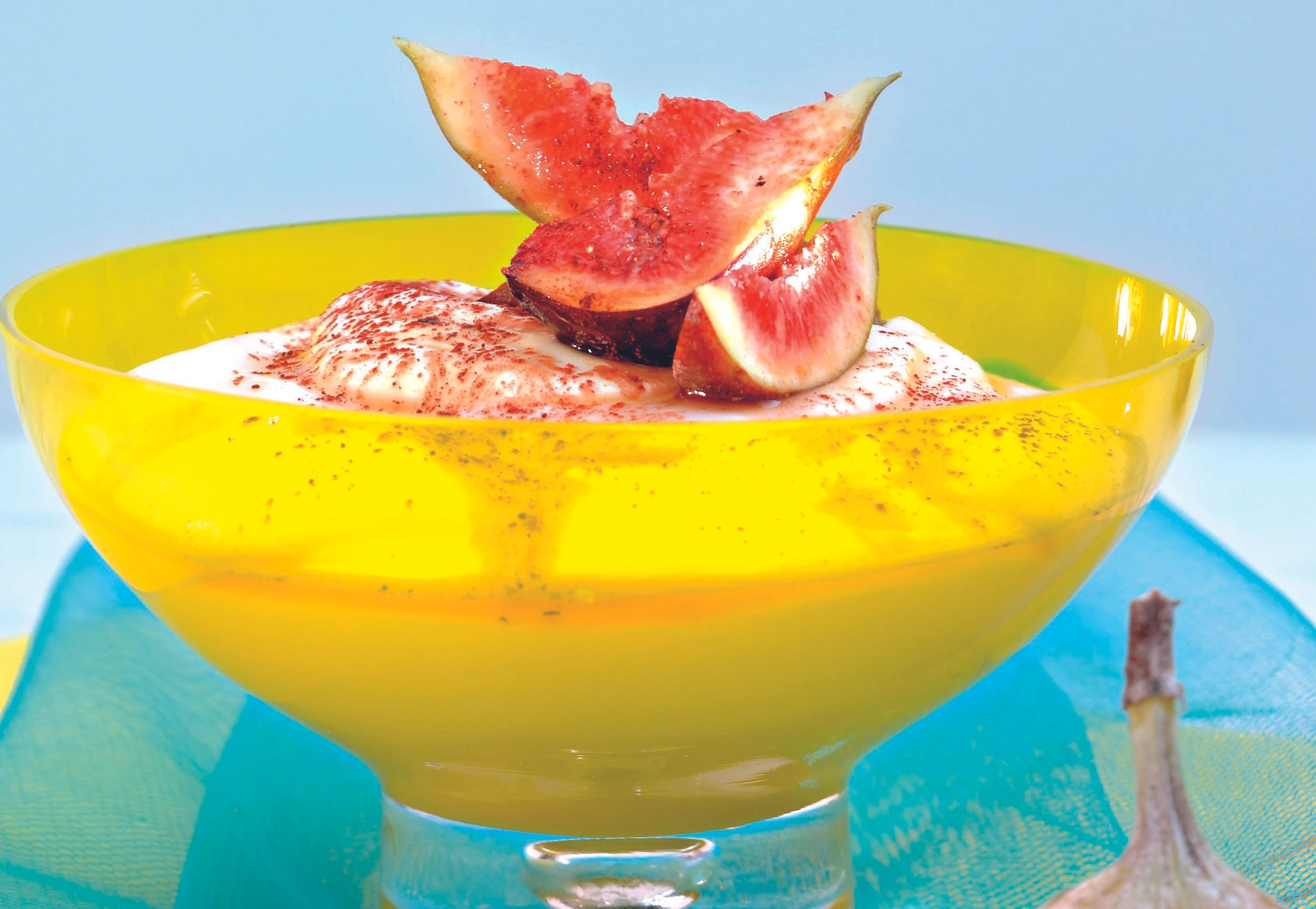 Cremen mit den Feigen belegen, mit dem Saft beträufeln und mit Kakao bestreuen.