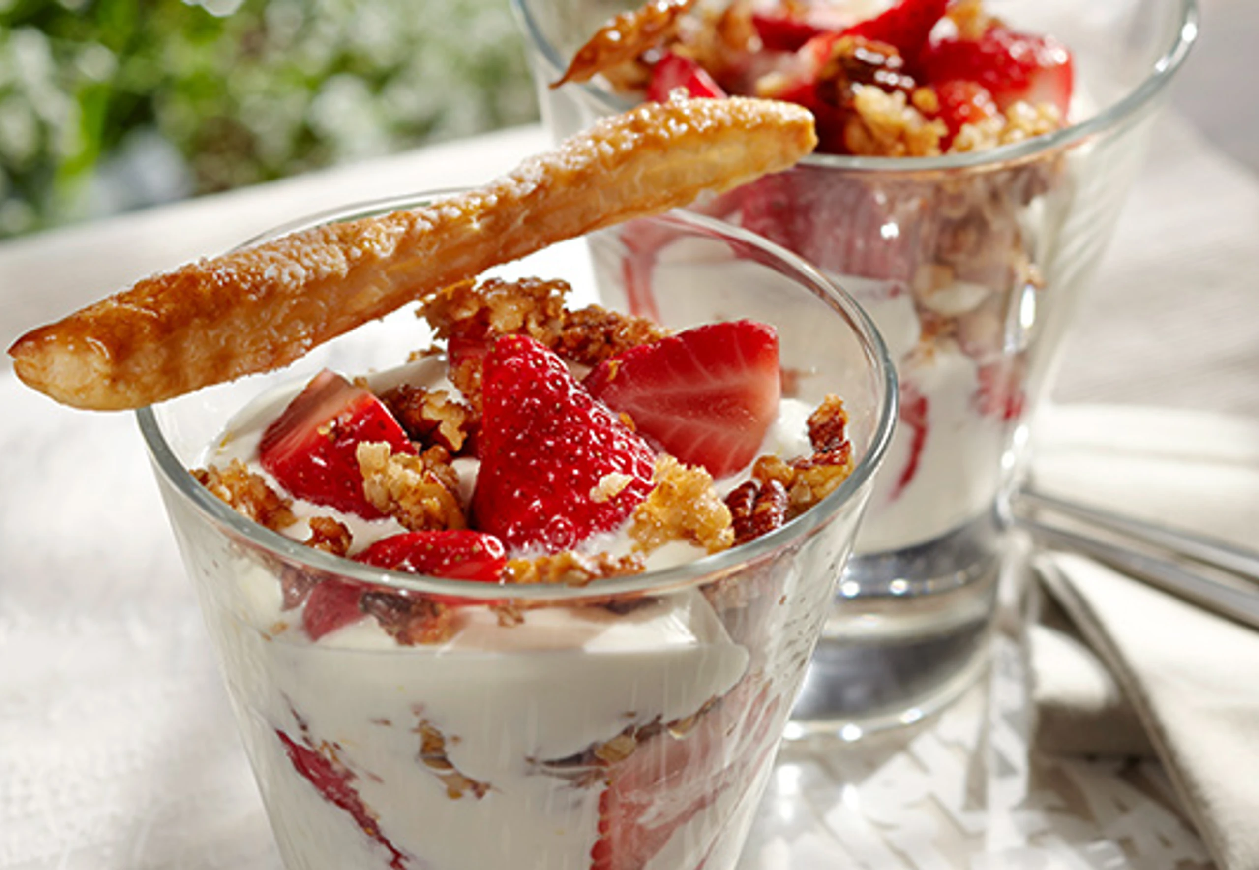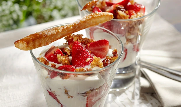 Erdbeeren putzen, längs halbieren und mit Limoncello vermischen. Creme, Erdbeeren und Streusel abwechselnd in Gläser (150 ml) schichten.