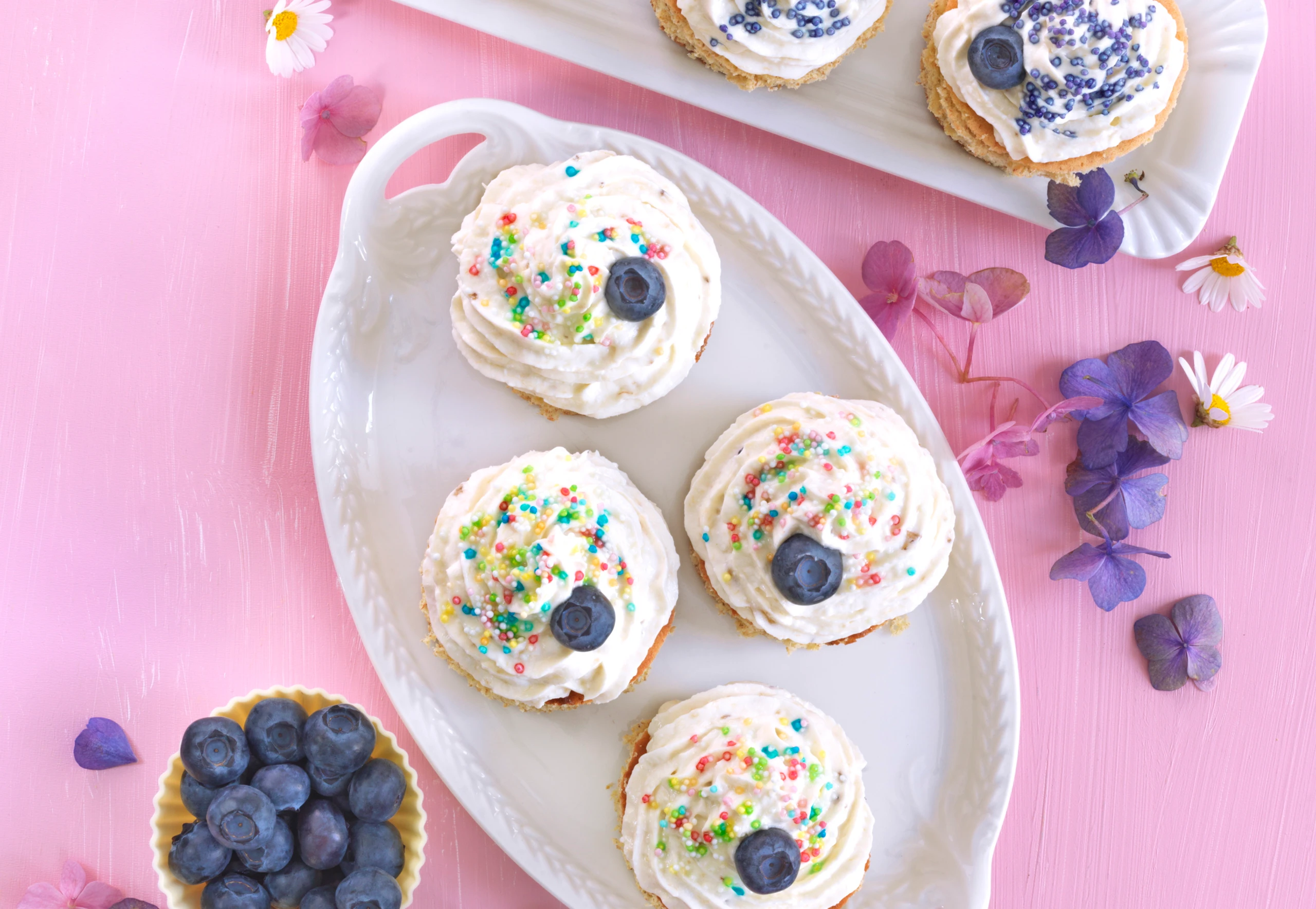 Aus dem Biskuit 10 Scheiben (Ø ca. 8 cm) ausstechen. Creme auf die Scheiben dressieren, Törtchen mit Heidelbeeren und Streuseln verzieren.