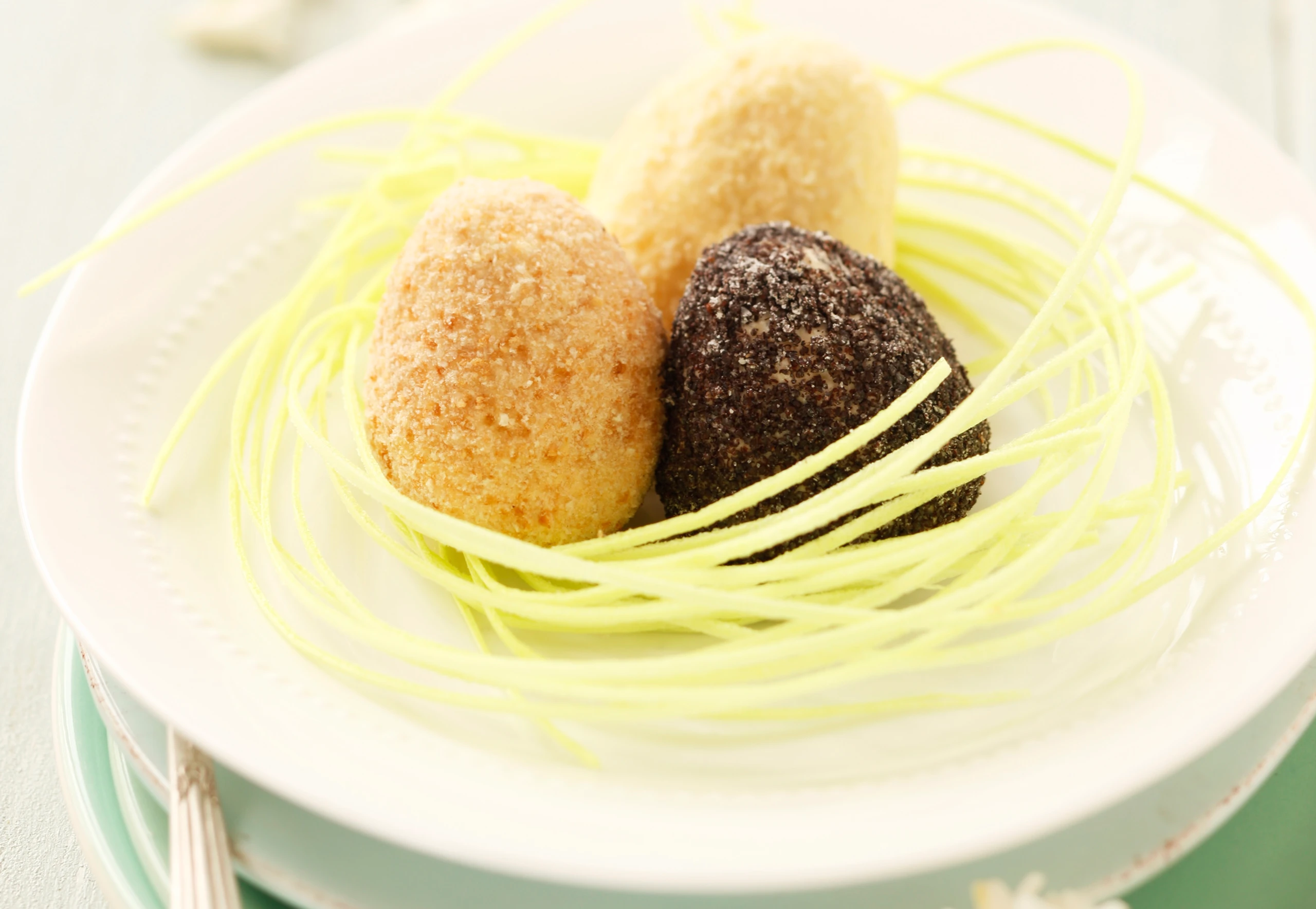 - Knödel herausheben, abtropfen lassen, je 5 Stück in Mohn, Mandeln und Bröseln wälzen. In einem Nest aus essbarem Gras anrichten.