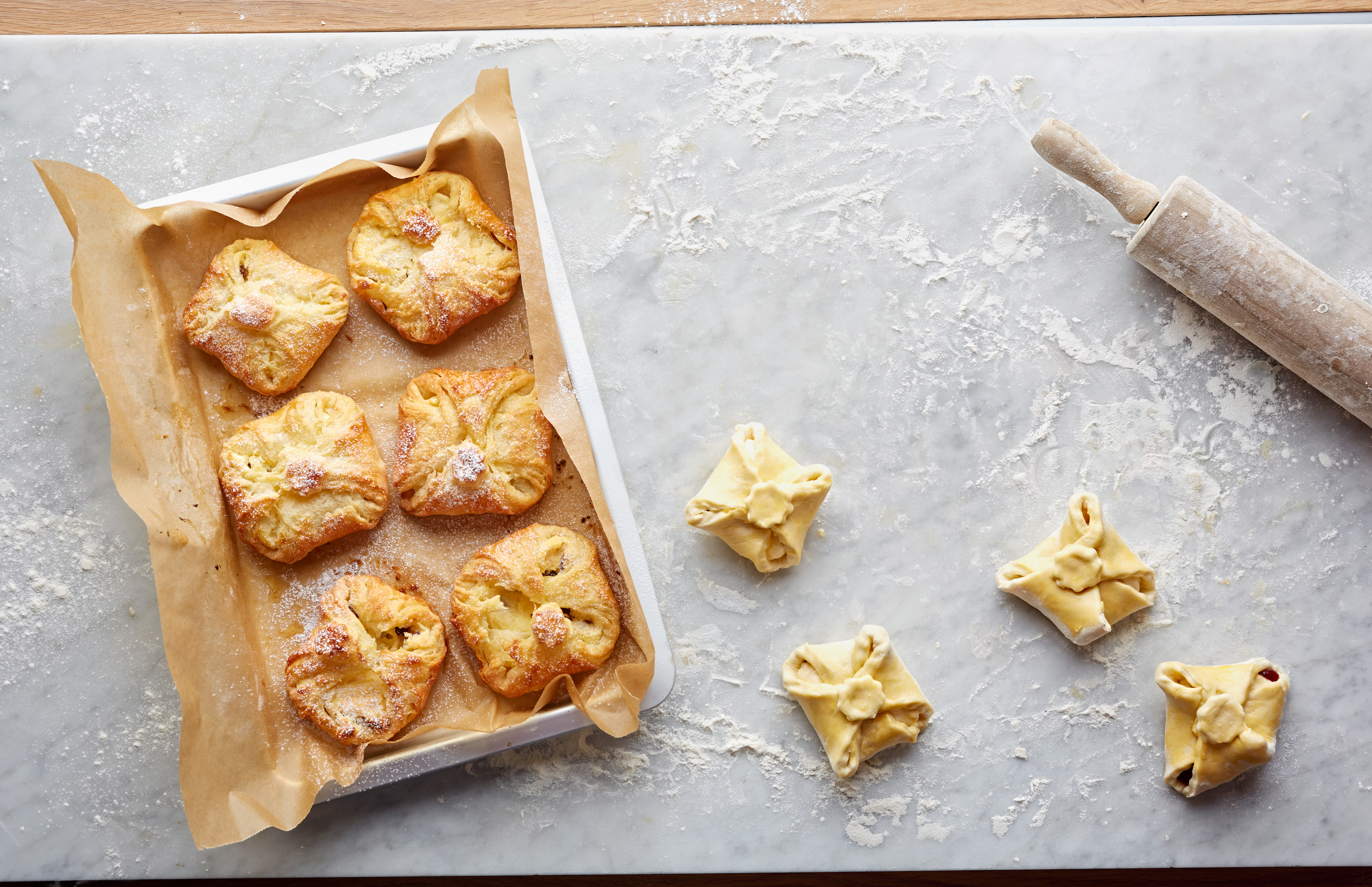 Die vier Ecken mit Ei bestreichen, übereinander einschlagen und zusammendrücken. Aus den Teigresten kleine Scheiben ausstechen und als Verschluss darauf setzen