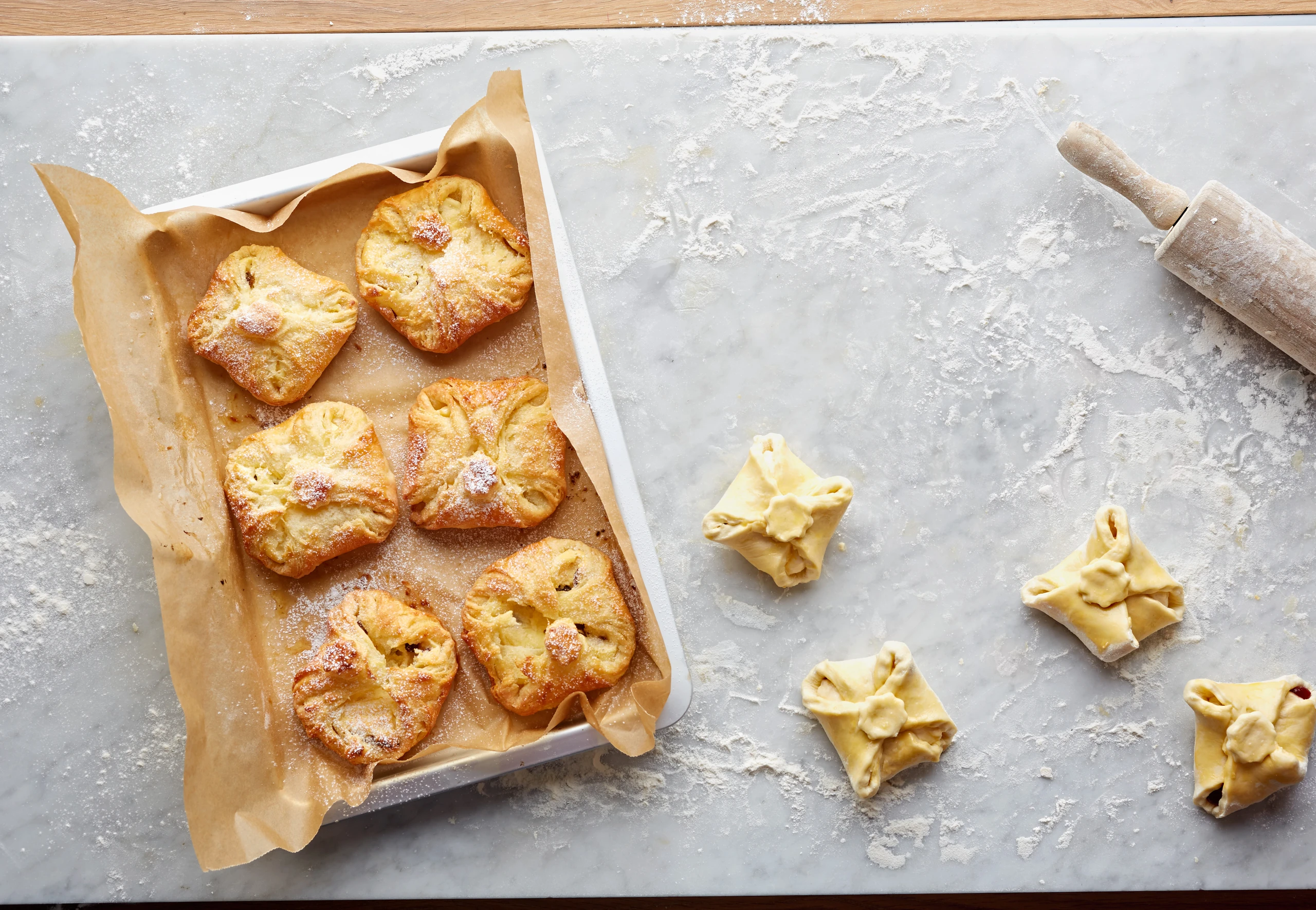 Die vier Ecken mit Ei bestreichen, übereinander ein-schlagen und zusammendrücken. Aus den Teigresten kleine Scheiben ausstechen und als Verschluss darauf setzen