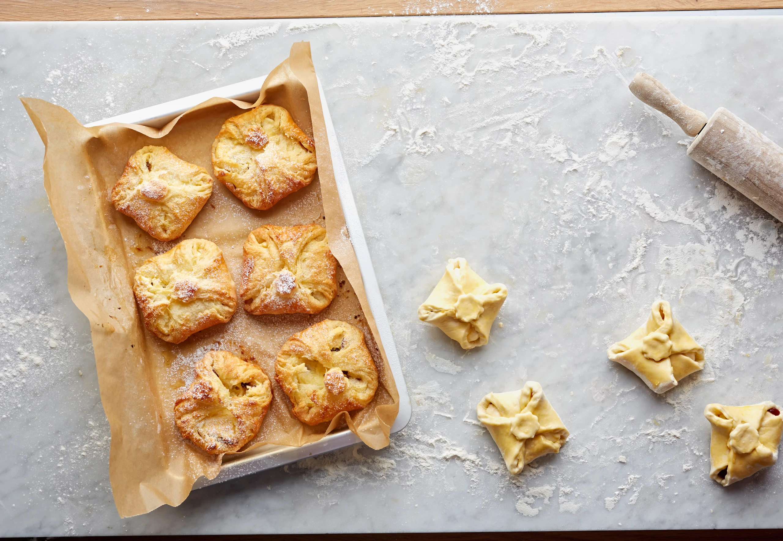 Rohr auf 200°C vorheizen. Backblech mit Backpapier belegen. Teig auf einer bemehlten Arbeitsfläche ausrollen.
