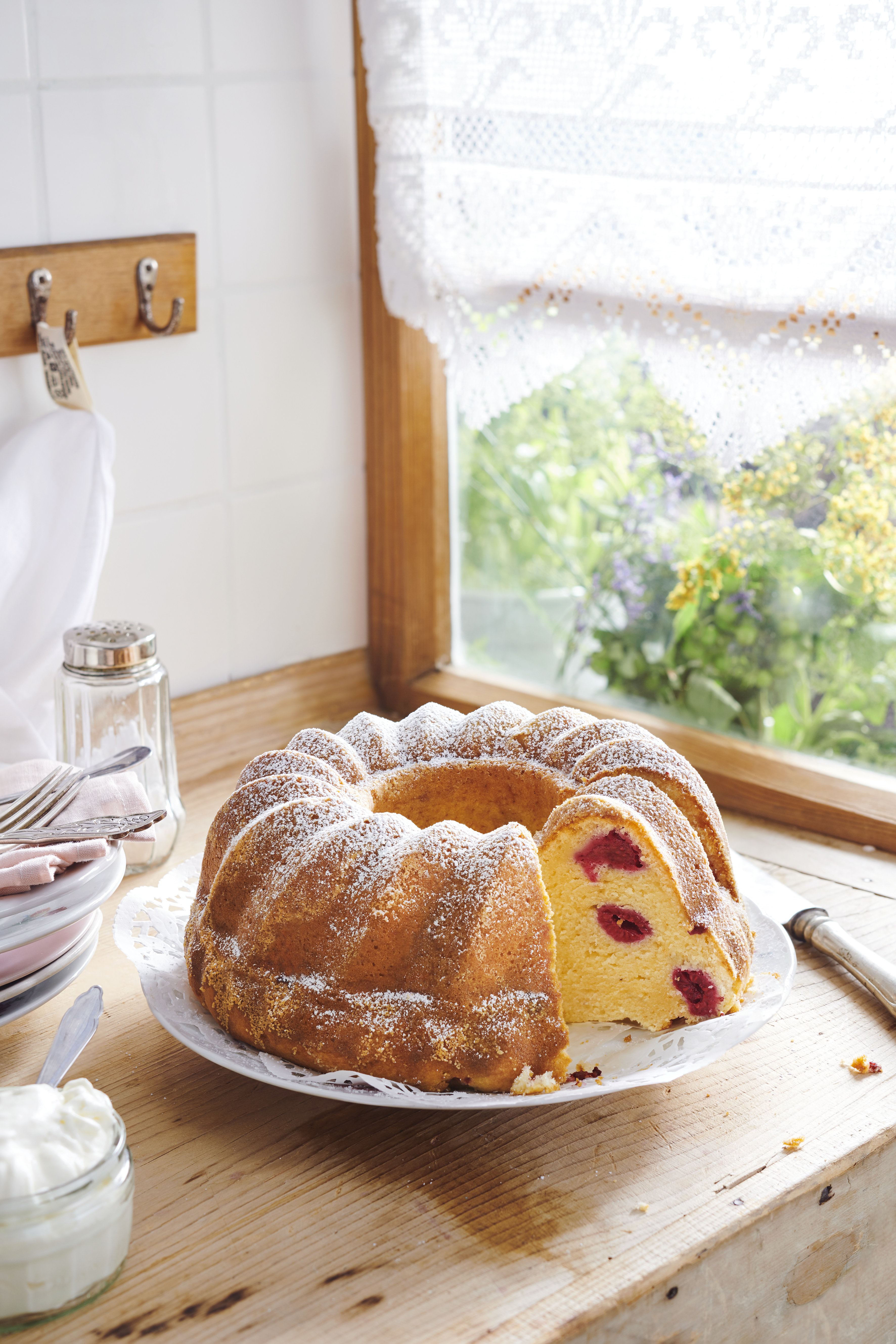 Rohr auf 180°C vorheizen. Gugelhupfform (Inhalt ca. 2,5 l) mit Butter einstreichen und mit Bröseln ausstreuen. Butter und Zucker ca. 5 Minuten schaumig rühren. Eier einzeln unterrühren. Topfen untermischen. Mehl und Backpulver einrühren. Himbeeren und Zitronenschale unterheben.