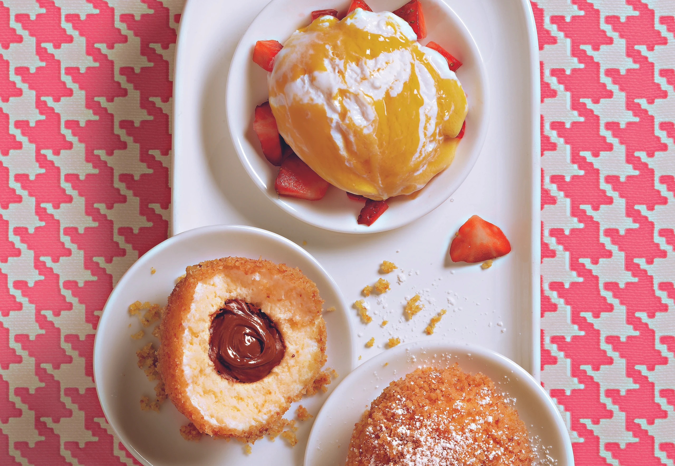 Nougat in 8 Portionen teilen, zu Kugeln formen und kurz in den Tiefkühler geben. Topfen und Basis für Topfenteig verrühren und 5 Minuten ziehen lassen.