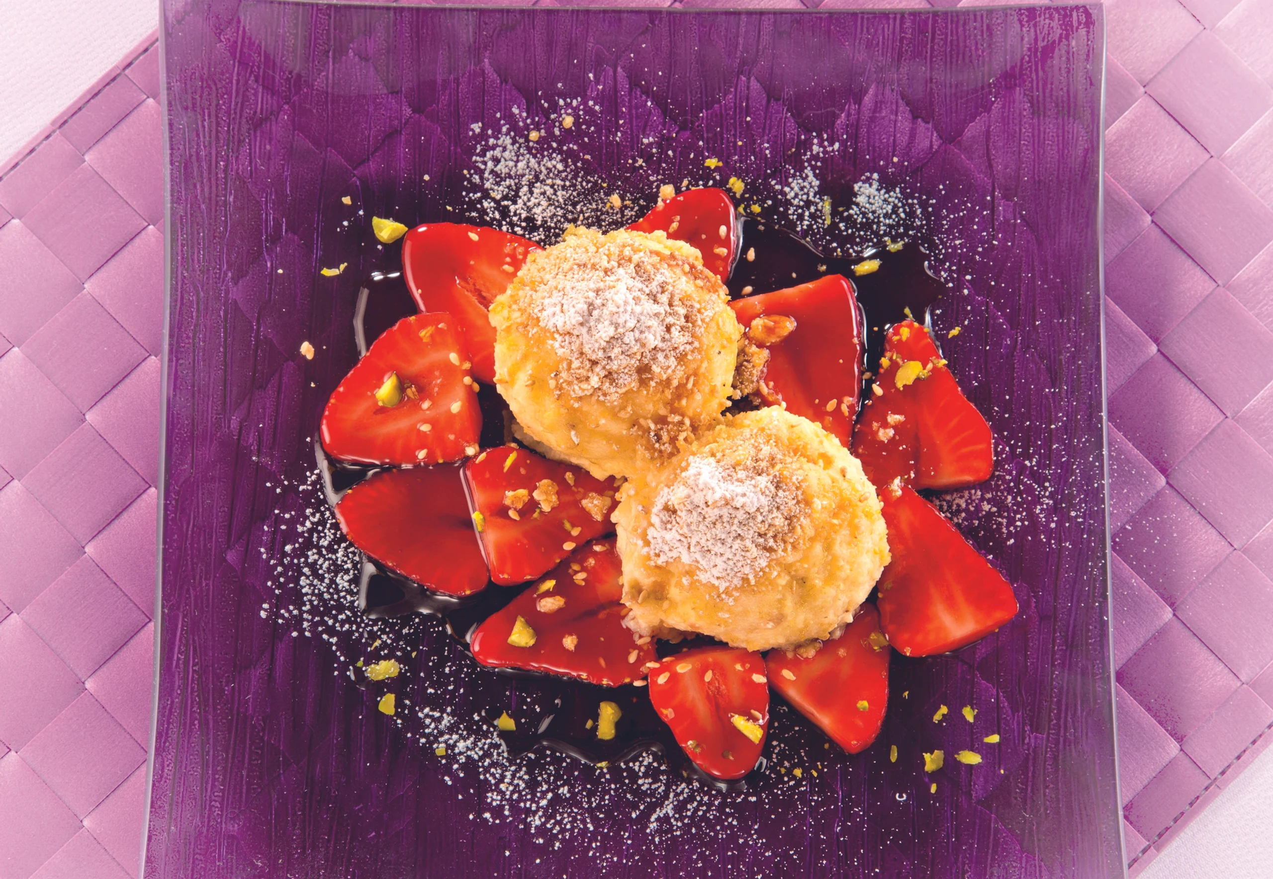 Topfenknödel mit Sesamkrokant und Balsamico-Erdbeeren