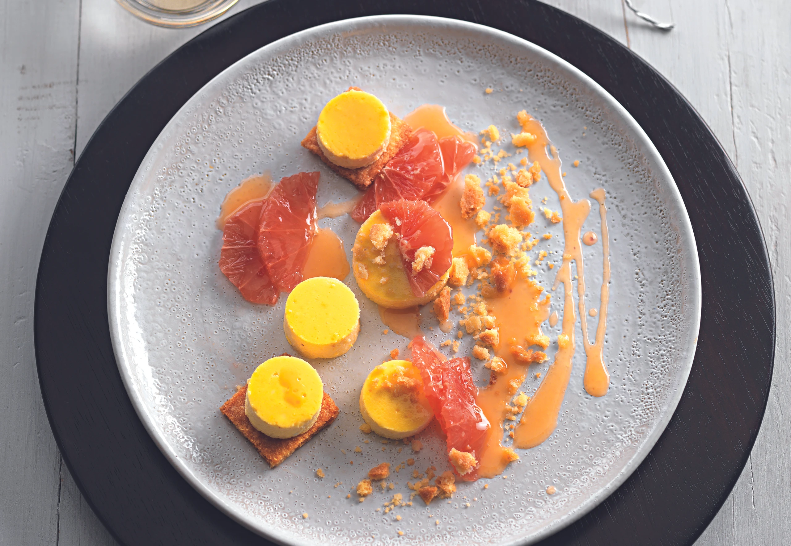 - Aus dem Topfenkuchen Scheiben (Ø 4 cm) ausstechen, auf die Teigecken setzen, mit Grapefruitfilets, -saft und den Bröseln garnieren.