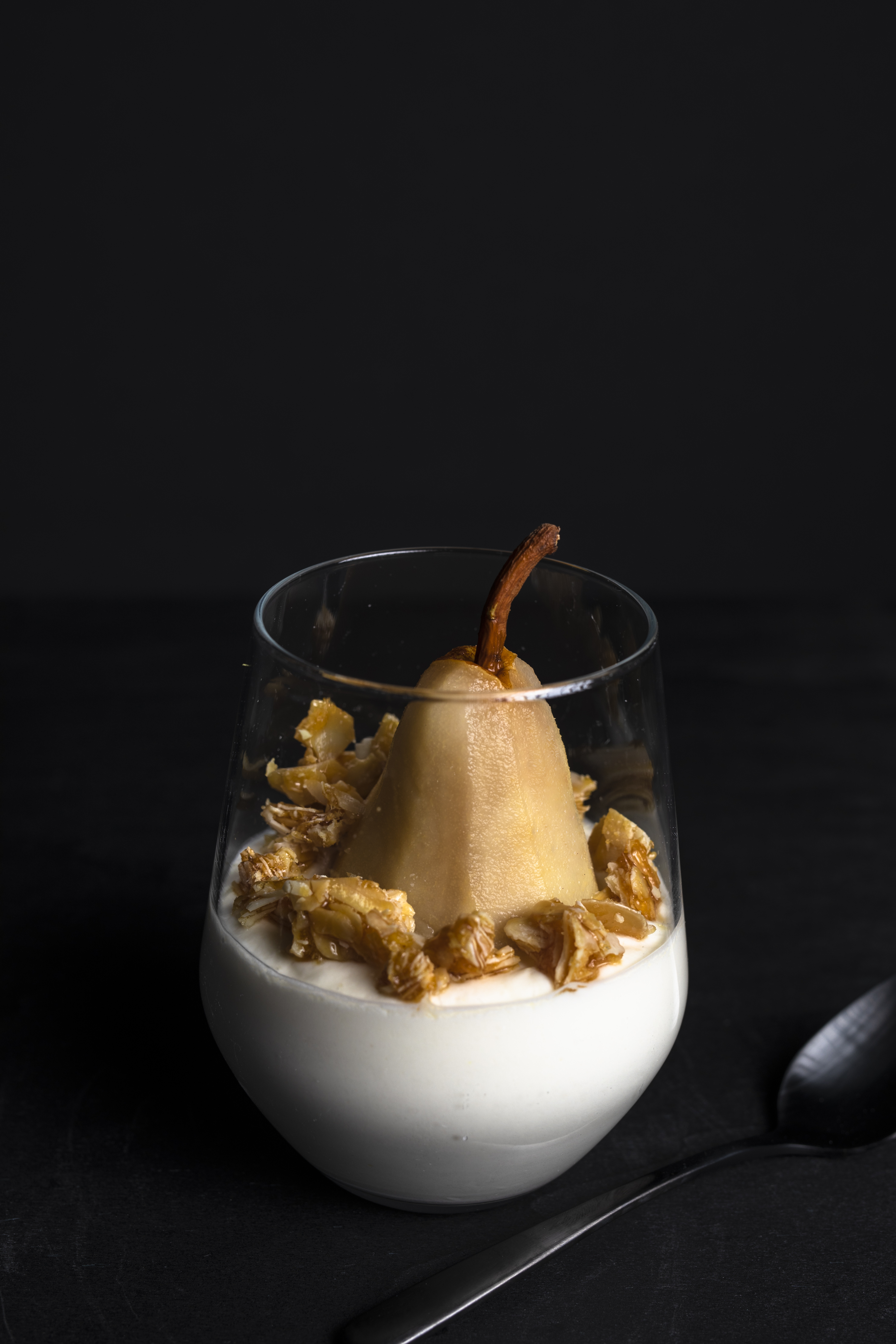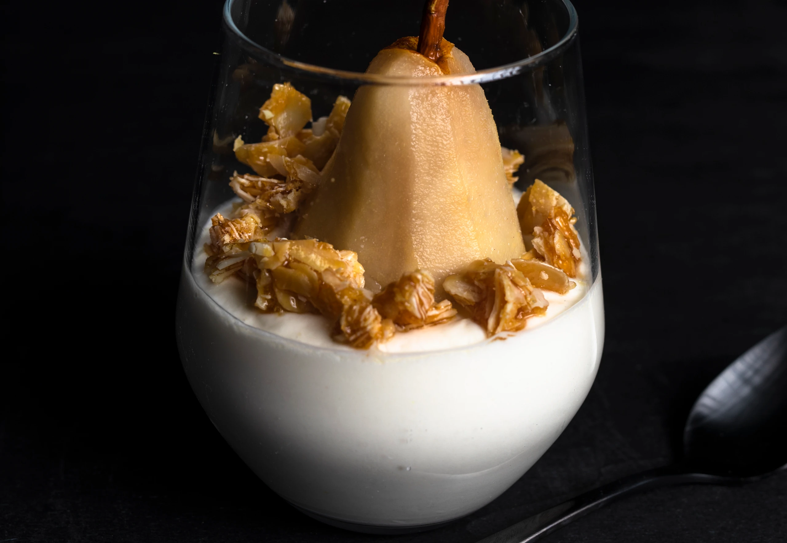Topfenmousse mit Birne und Mandelcrunch