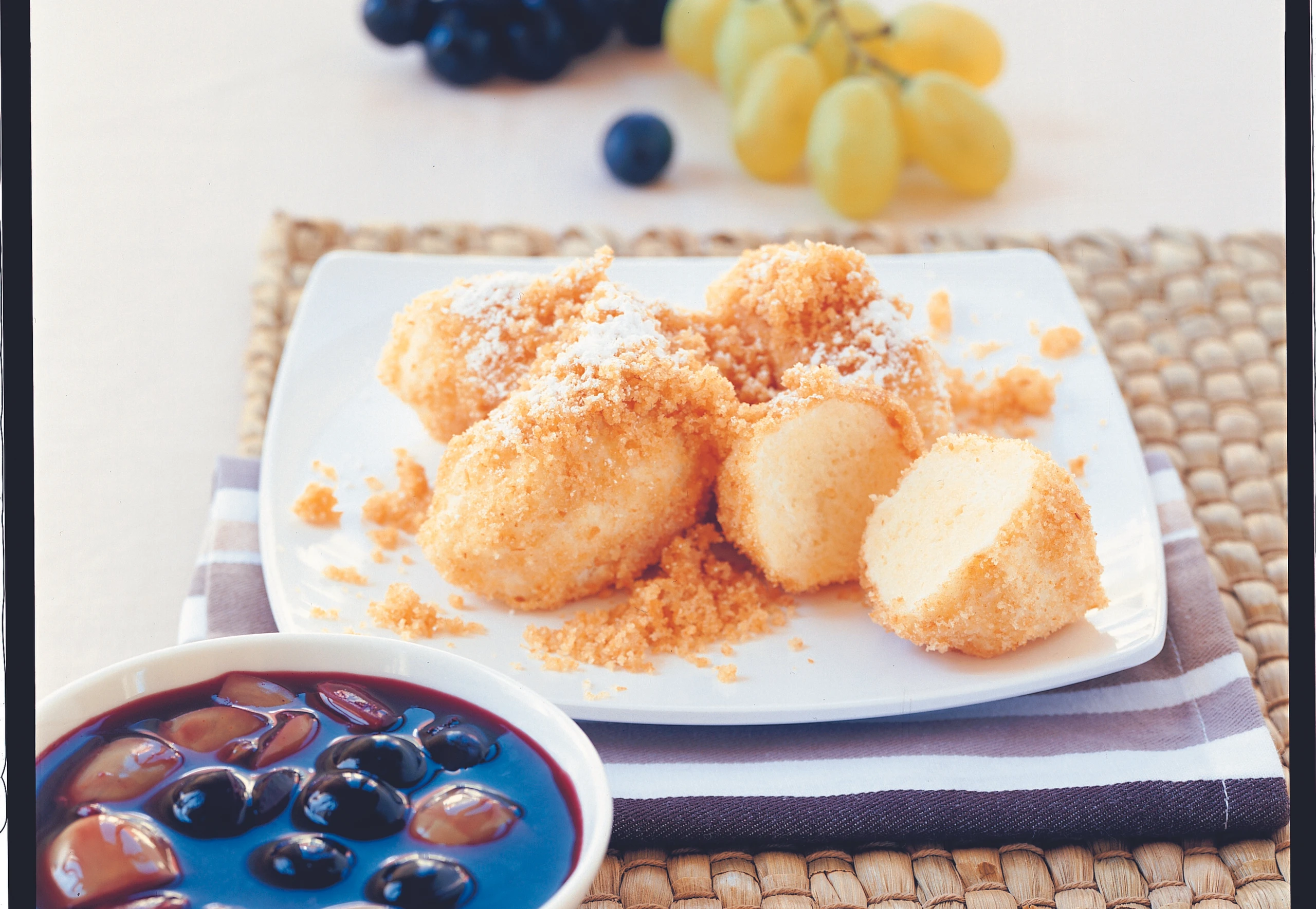 In einer beschichteten Pfanne Butter aufschäumen, Brösel darin goldbraun rösten. Nockerl aus dem Wasser heben, abtropfen lassen und in den Bröseln wälzen. Nockerl mit Minze garnieren und mit dem Traubenragout servieren.