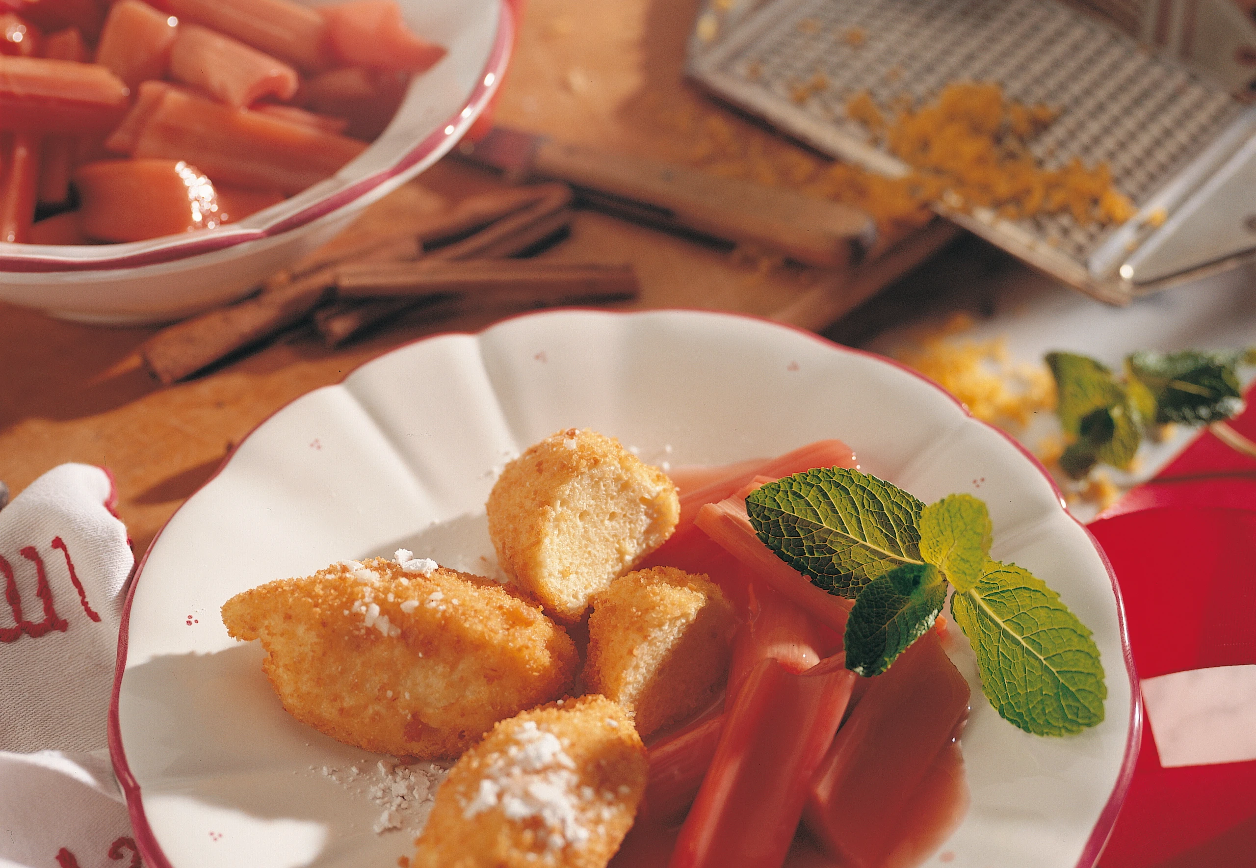 Topfen mit Staubzucker, Vanillezucker, Sauerrahm, Grieß, 1 Prise Salz, abgeriebener Zitronenschale, 1 Ei und 1 Dotter glattrühren – restliches Eiklar wird zum Panieren der Nockerln benötigt.