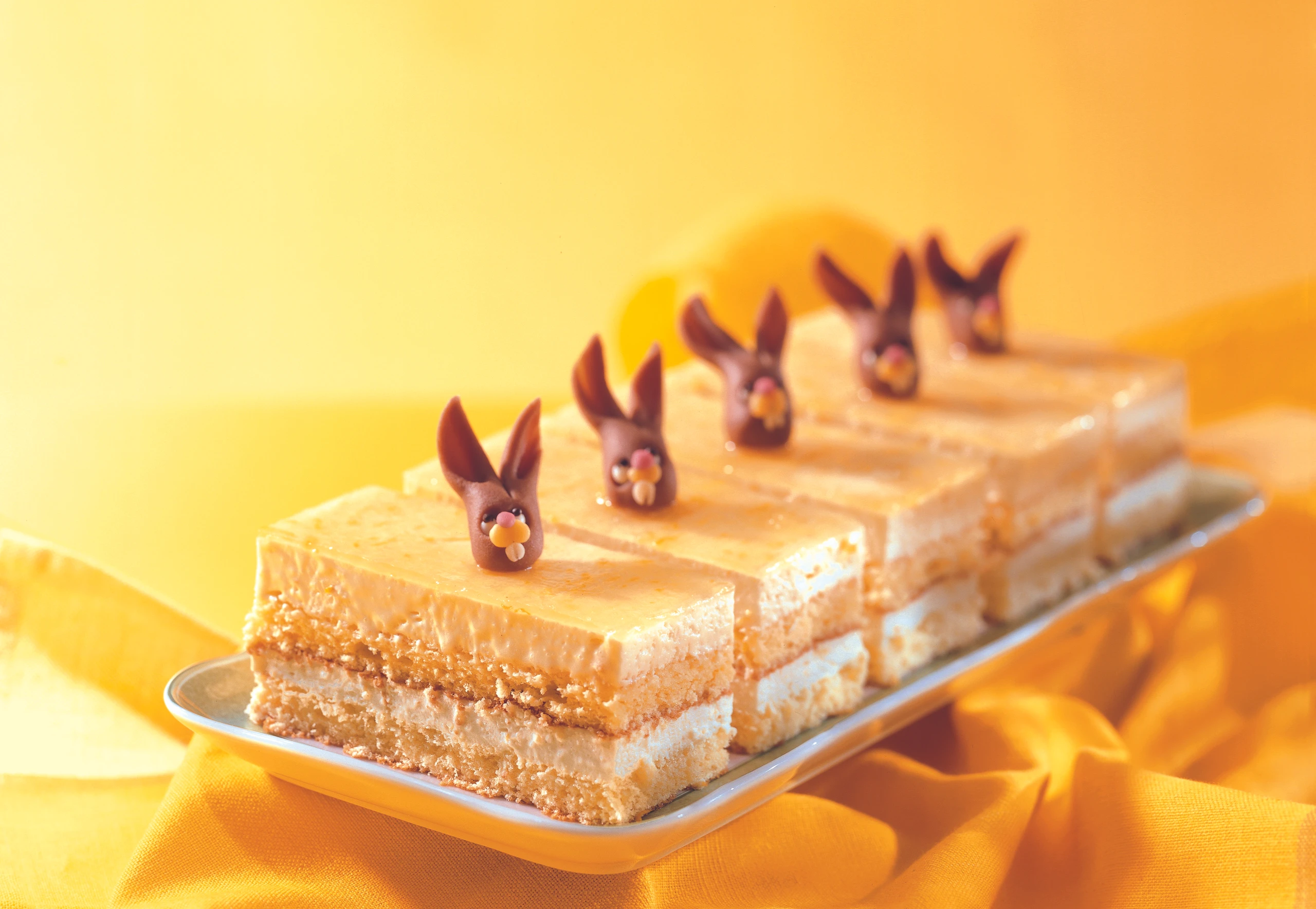 Zitronenglasur über die Schnitte gießen und gleichmäßig verstreichen, am besten mit einem Pinsel. Schnitten zum Festwerden der Glasur für ca. 1 Stunde in den Kühlschrank stellen.10 Schnitte mit einem Messer vom Formenrand lösen. Die Rahmenform abheben. Schnitte mit Häschenköpfen garnieren und in 8 Portionen schneiden.