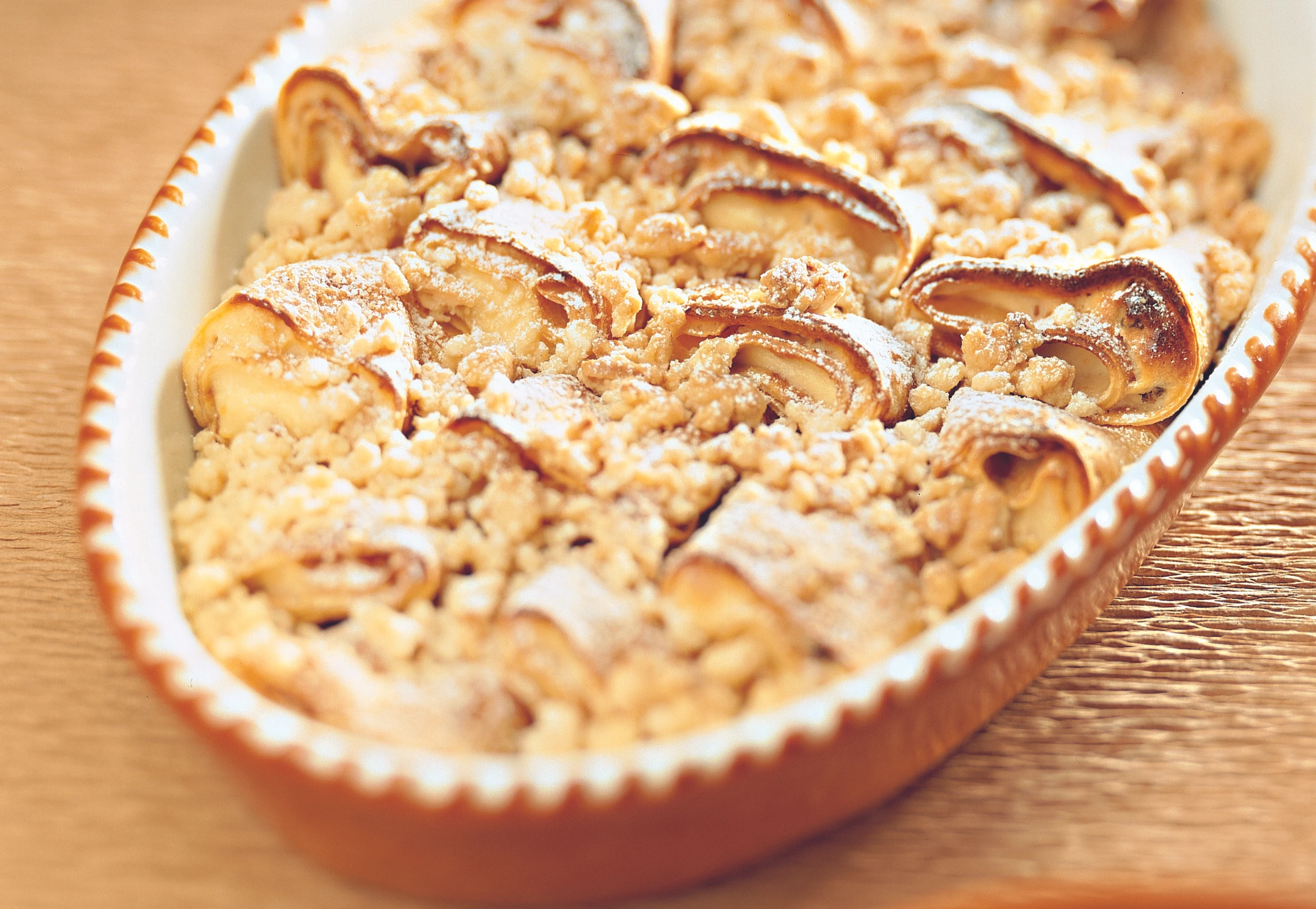 Palatschinken dachziegelartig in die Form schichten, mit dem Streusel bestreuen und im vorgeheizten Rohr (mittlere Schiene / Gitterrost) ca. 40 Minuten backen. Palatschinken mit Staubzucker bestreut servieren.