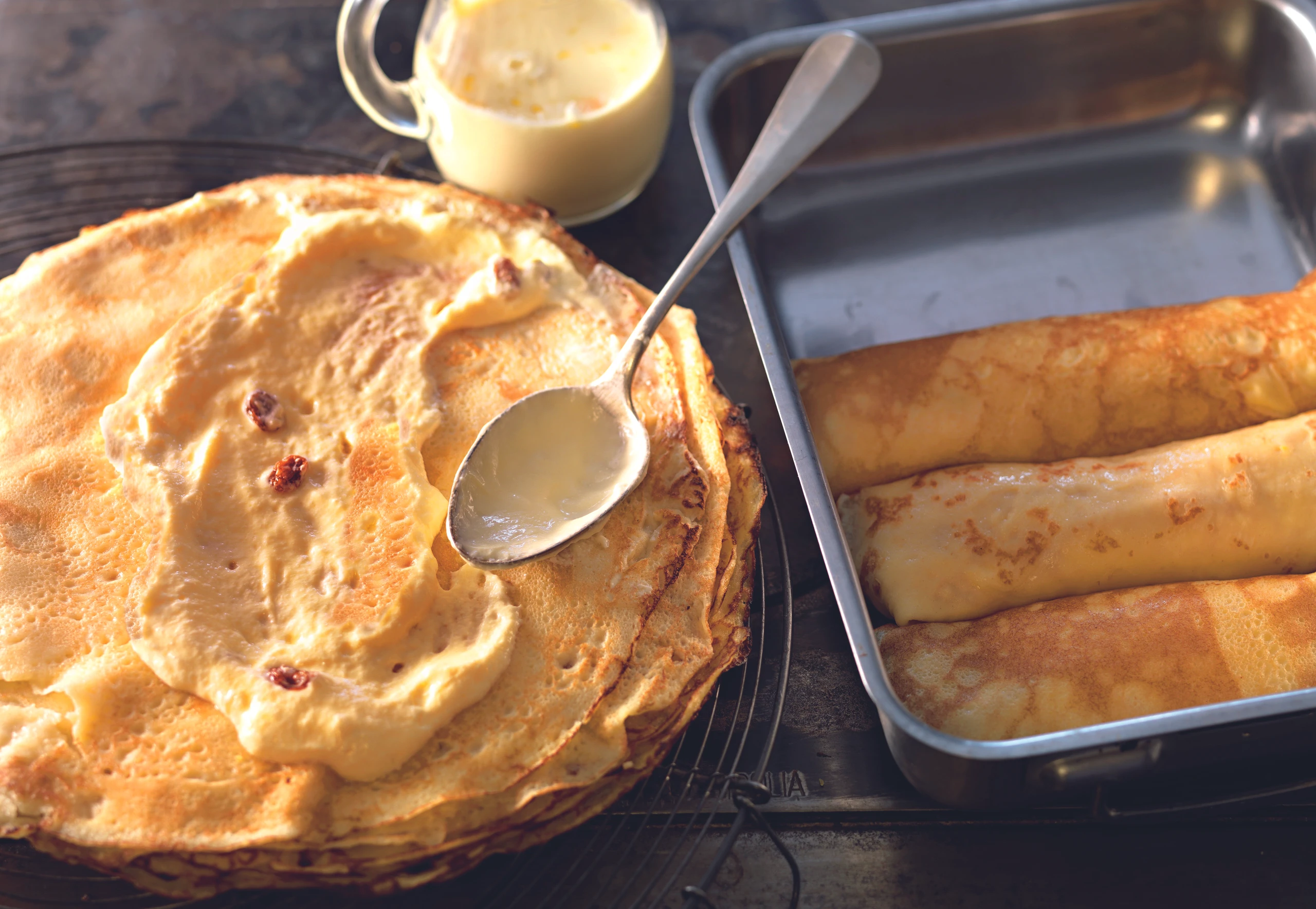 Palatschinken mit Fülle bestreichen, einrollen und eng nebeneinander in zwei ofenfeste Formen legen. Im Rohr (Gitterrost / untere Schiene) ca. 10 Minuten anbacken.