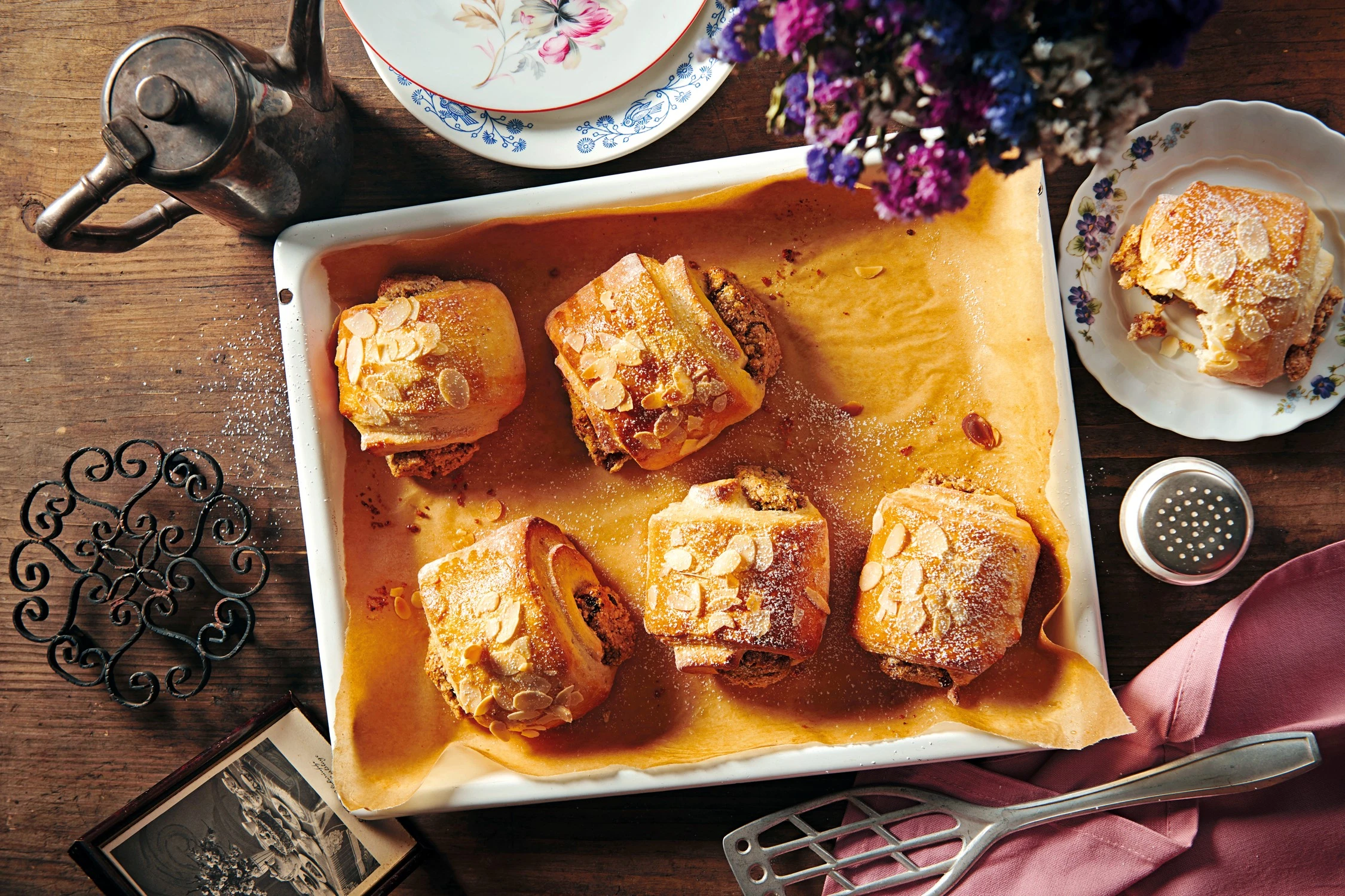 Teigröllchen auf das Blech legen. Mit Ei bestreichen und mit Mandelblättchen bestreuen. Im Rohr (mittlere Schiene) ca. 25 Minuten goldbraun backen. Herausnehmen und mit Staubzucker bestreut servieren.