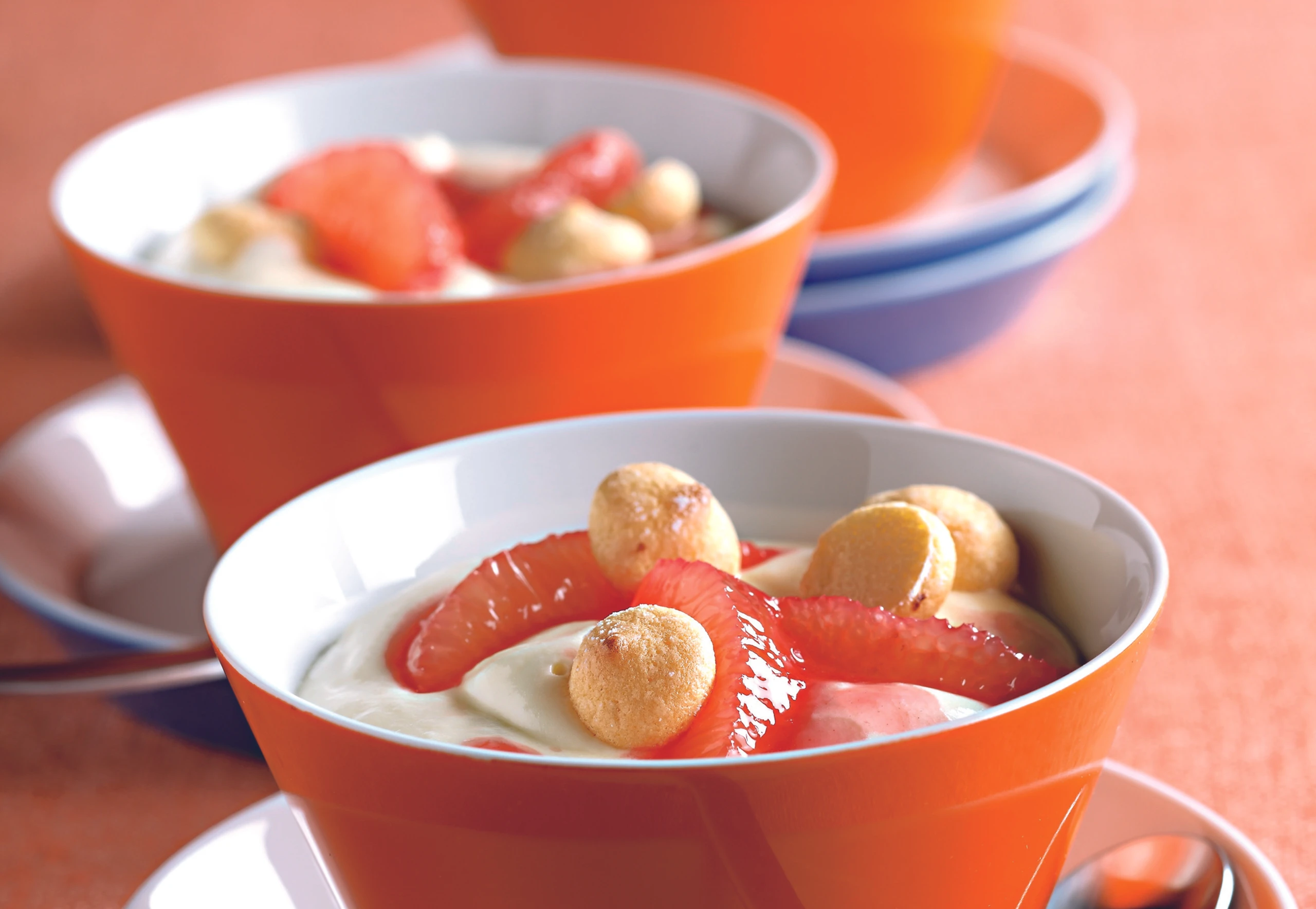 - Topfencreme mit Grapefruits und Biskotten garnieren.