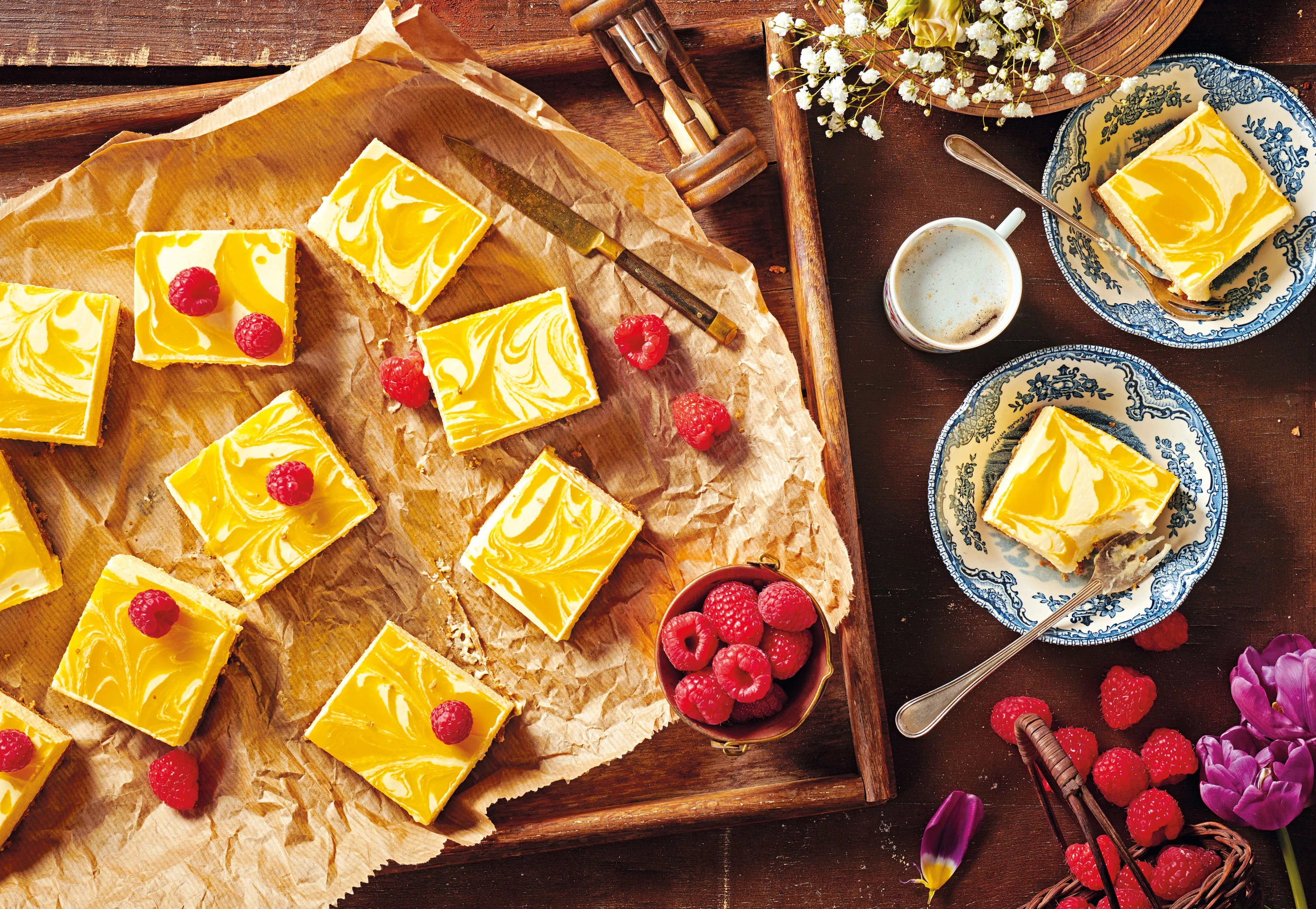 Topfenschnitte aus der Form lösen, in Stücke schneiden und servieren.