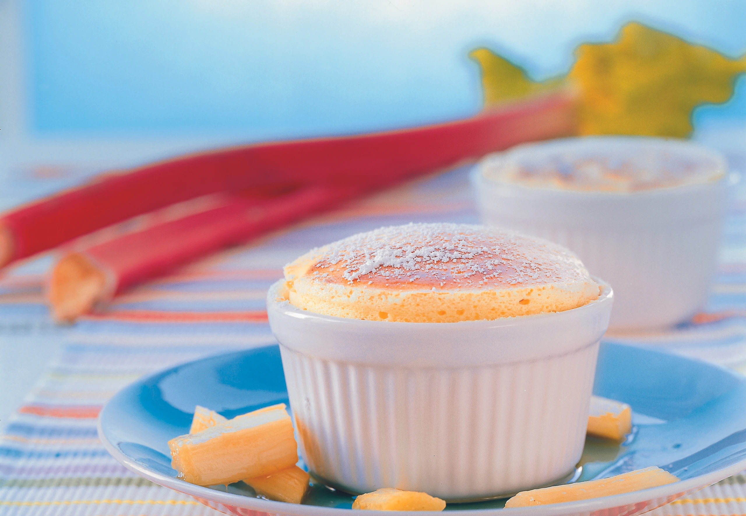 Soufflés aus dem Backrohr nehmen, mit Staubzucker bestreuen und sofort mit dem karamellisierten Rhabarber anrichten.