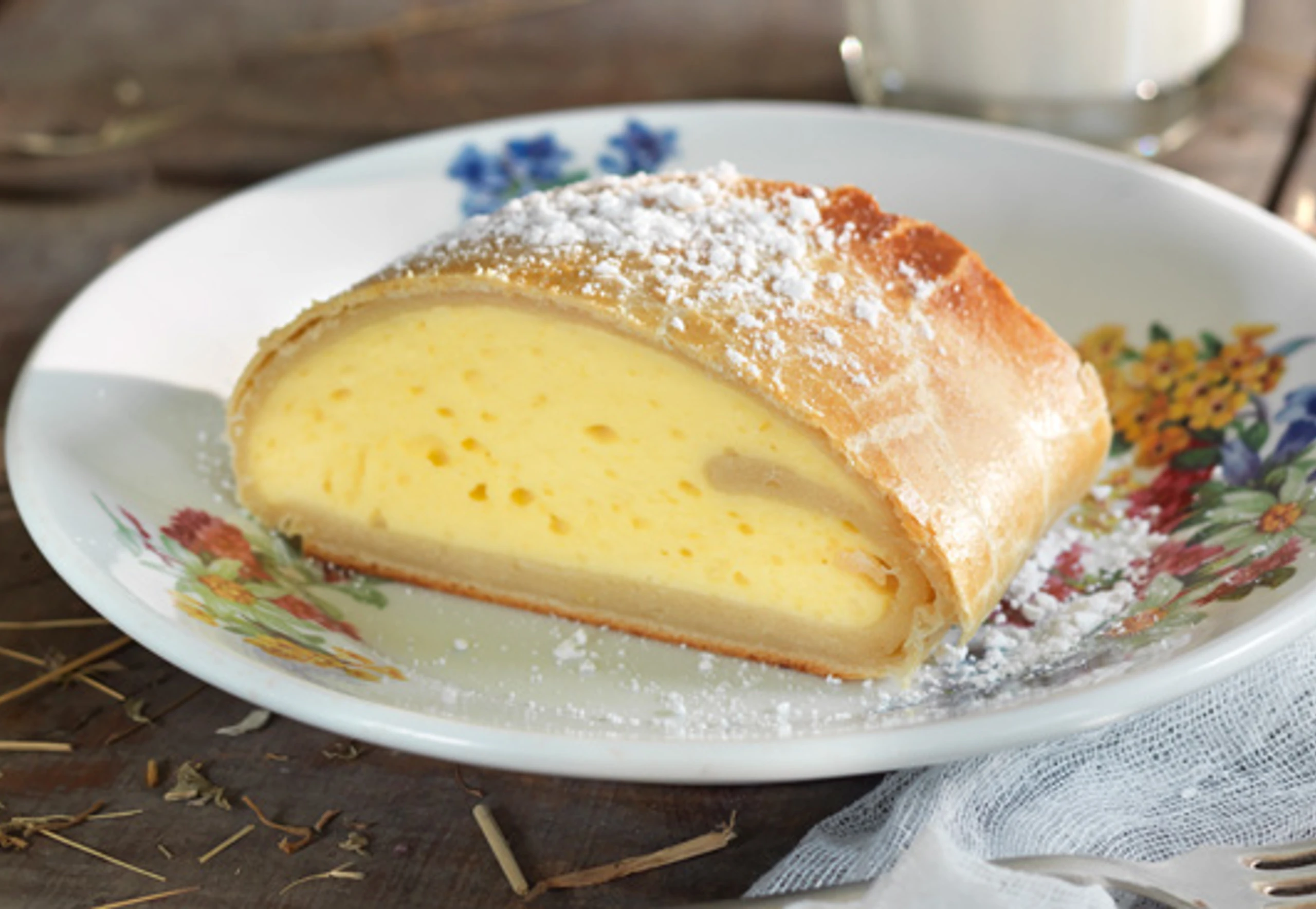 Rohr auf 180°C vorheizen. Teig auf einer bemehlten Arbeitsfläche dünn ausrollen und auf ein Stück Backpapier legen. Fülle als Streifen der Länge nach auftragen, Teig einrollen. Strudel auf ein Blech legen, mit einer Gabel mehrmals einstechen, im Rohr (mittlere Schiene) ca. 45 Minuten backen. Strudel am besten lauwarm mit Staubzucker bestreut servieren.