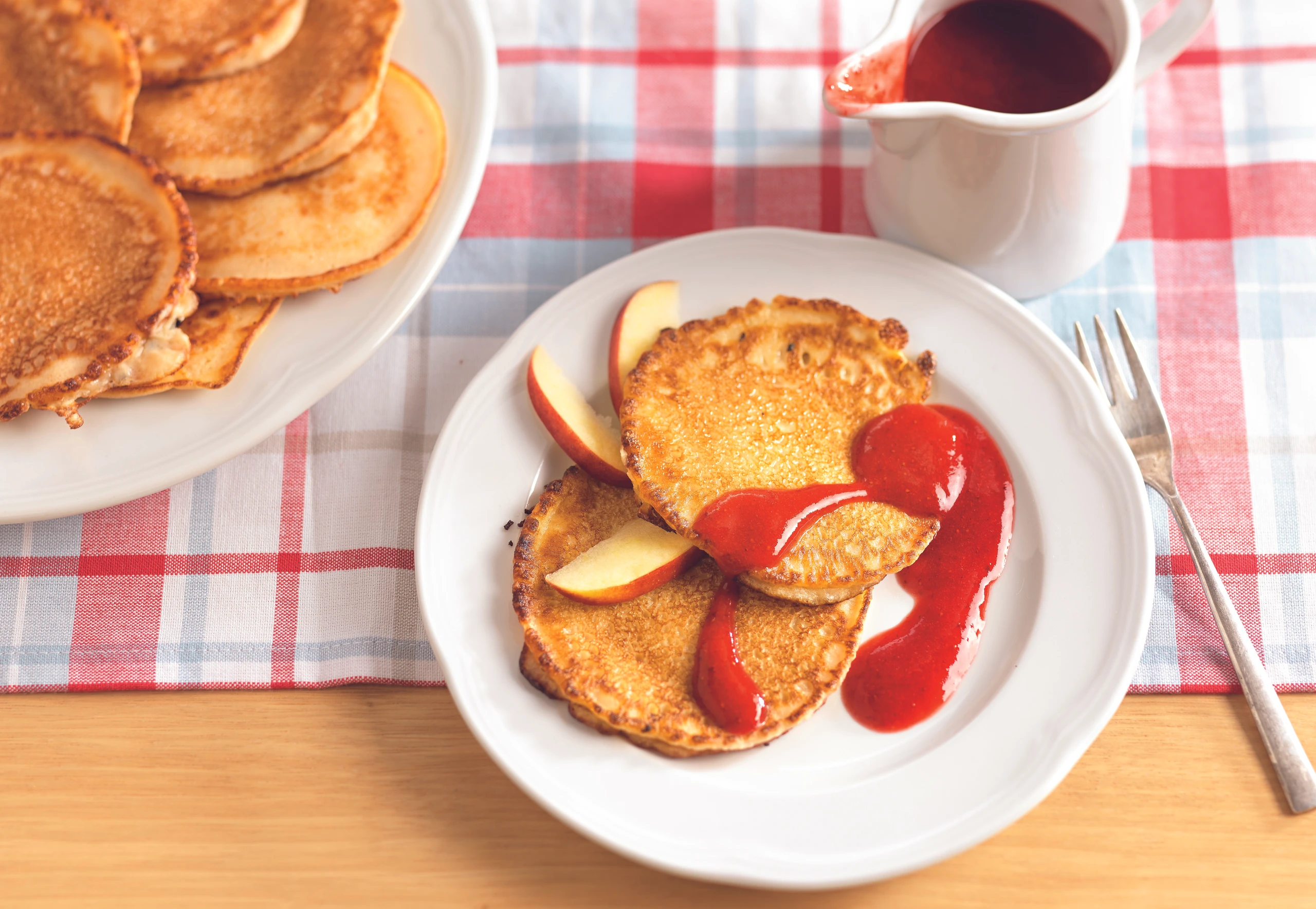 Übrigen Teig ebenso verarbeiten. Taler mit Sauce und Apfelspalten anrichten.