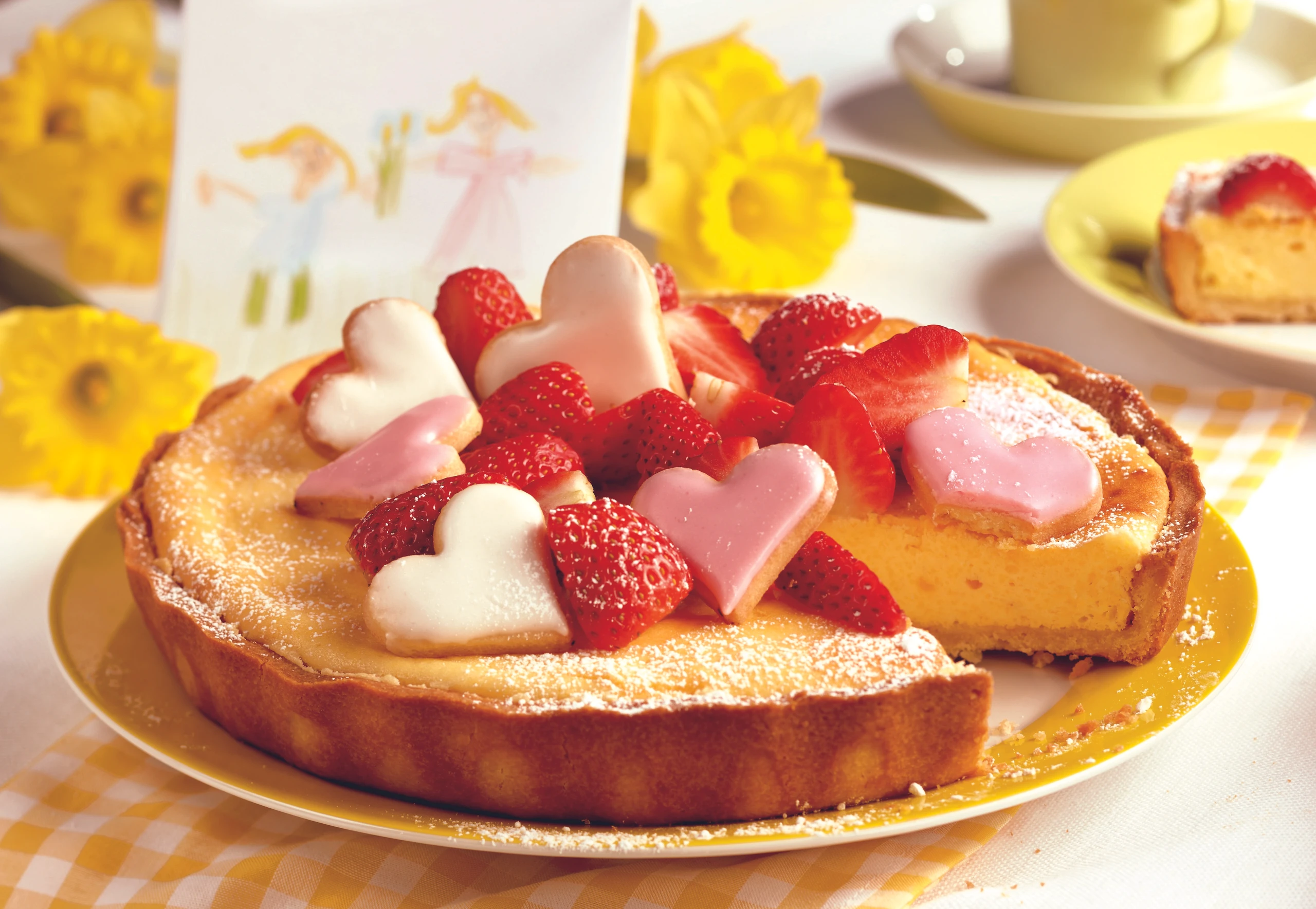 Für die Glasur Zucker mit Zitronensaft verrühren, die Hälfte der Glasur mit Sirup rosa färben. Herzen mit der Oberseite in die Glasur tauchen und zum Trocknen auf Backpapier legen. Erdbeeren in Stücke schneiden. Torte mit Erdbeeren und Herzen garnieren, mit Staubzucker bestreuen.