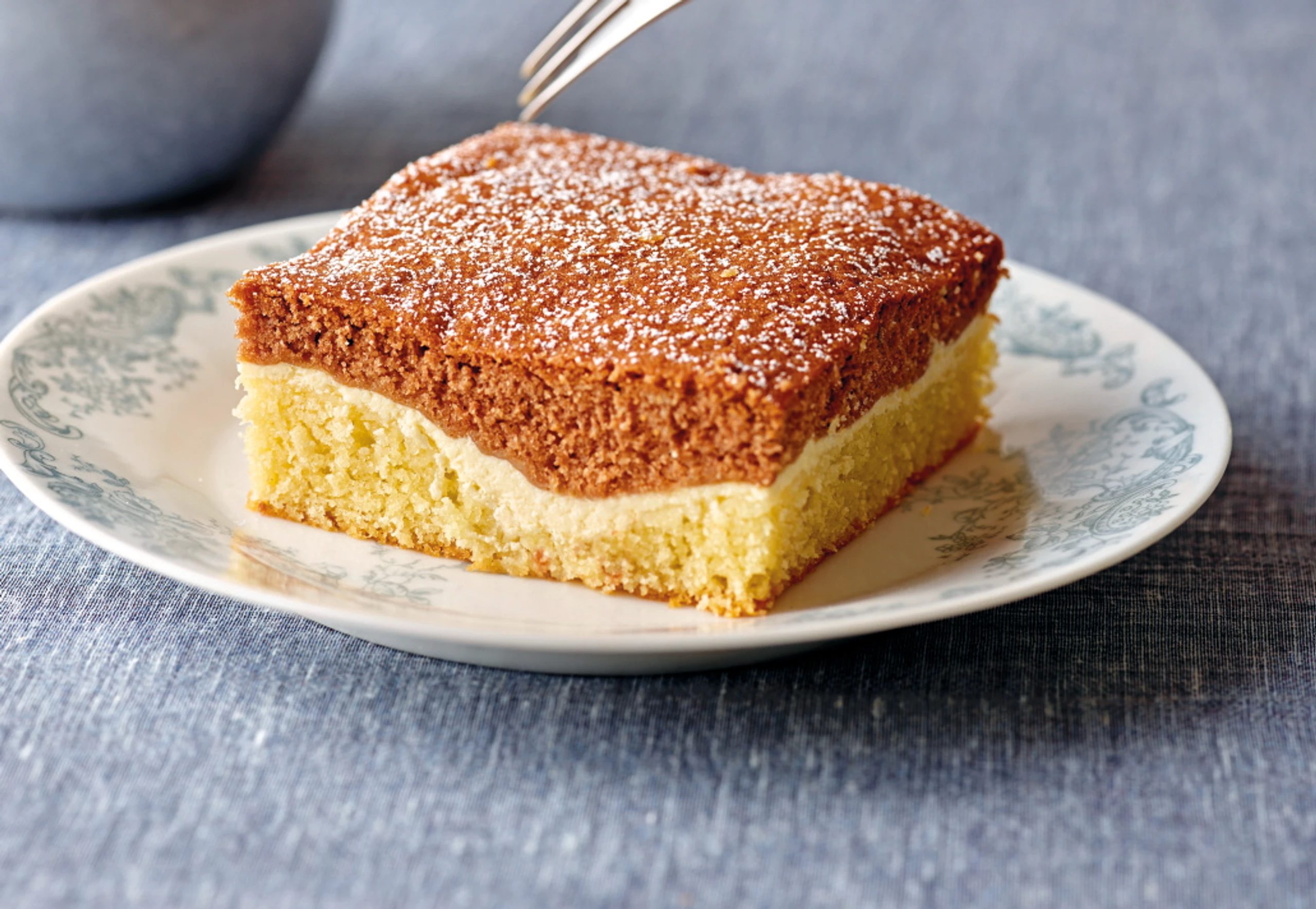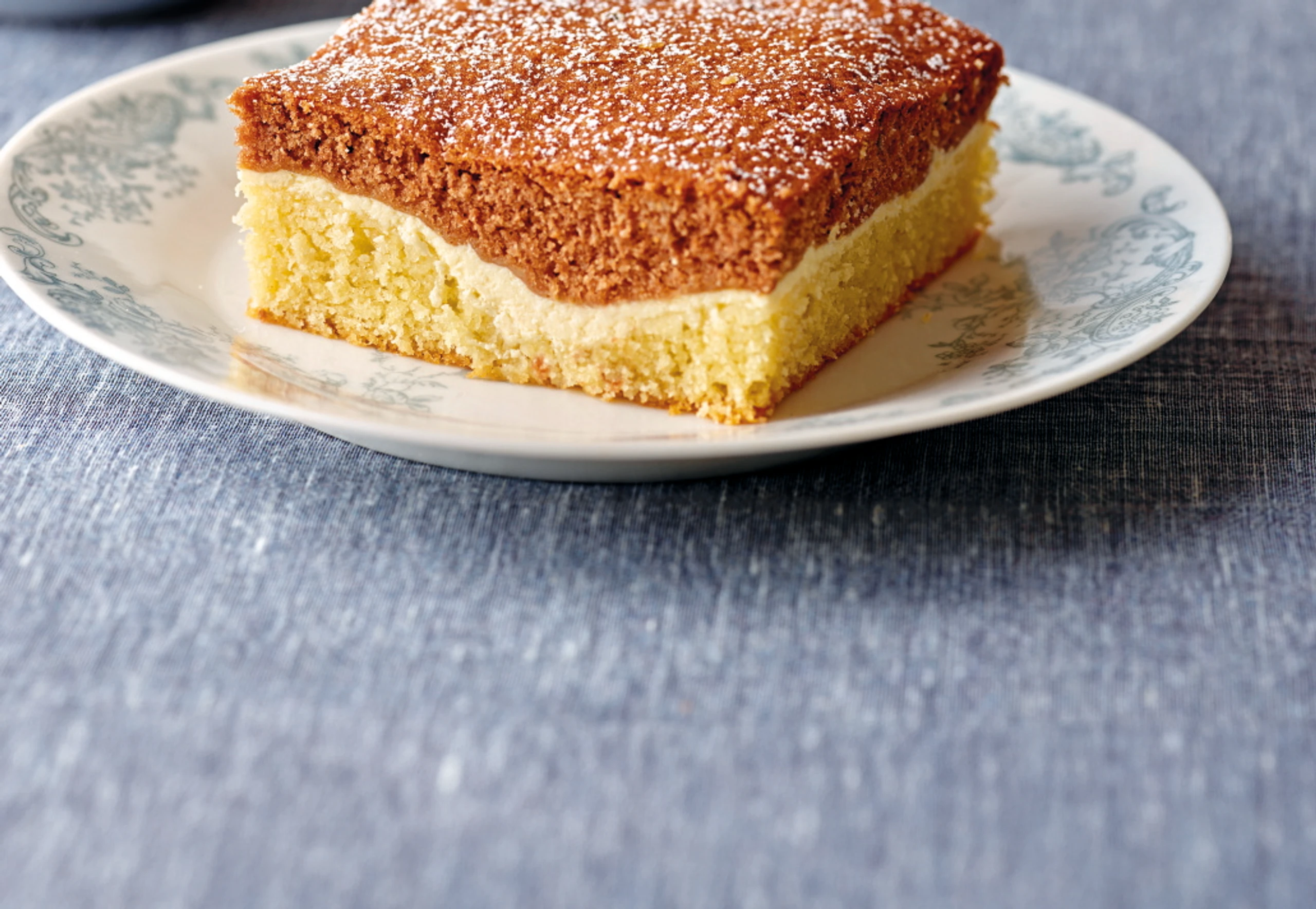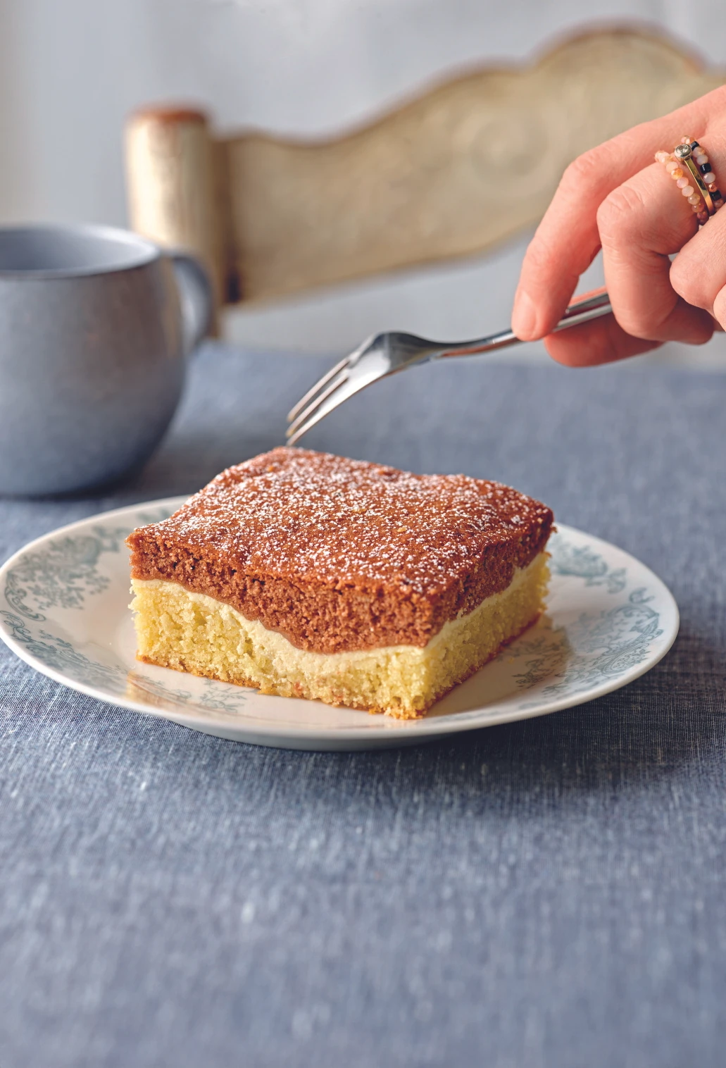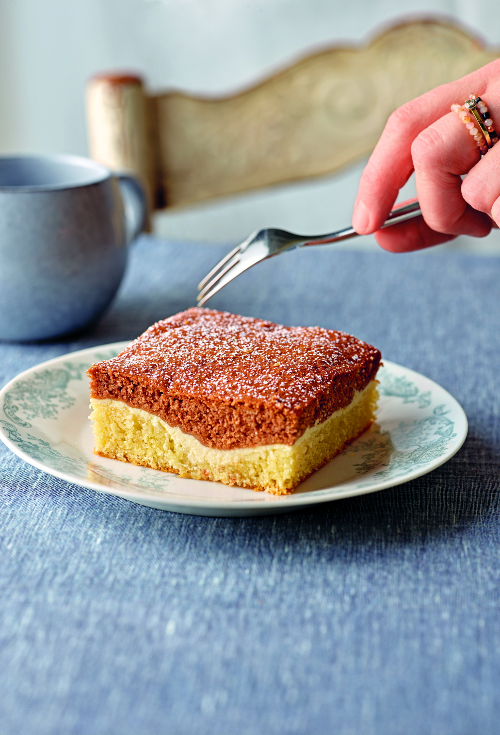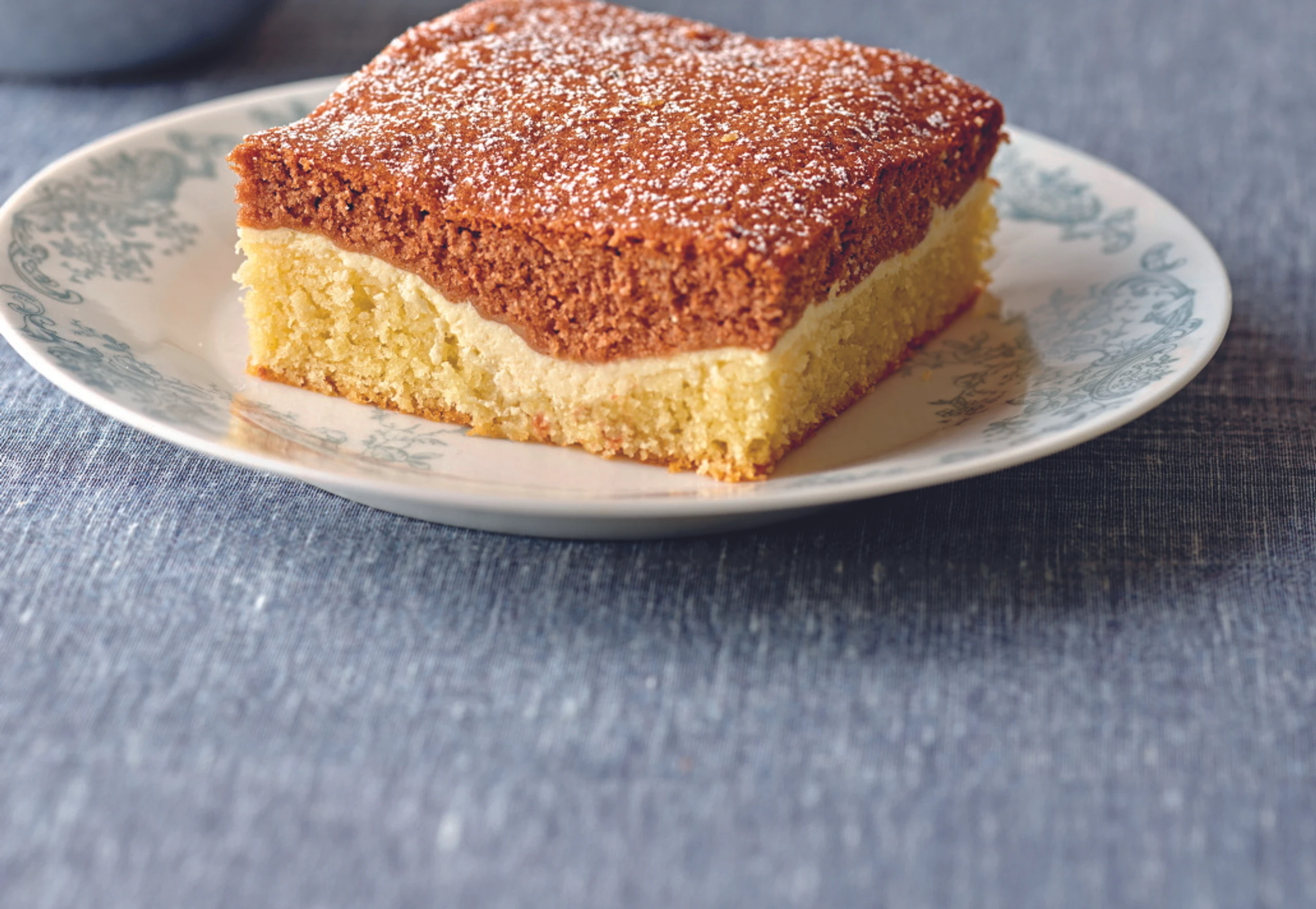 Im Rohr (mittlere Schiene) ca. 50 Minuten backen. Herausnehmen, auskühlen lassen, in 8 x 8 cm große Stücke schneiden und mit Staubzucker besieben.