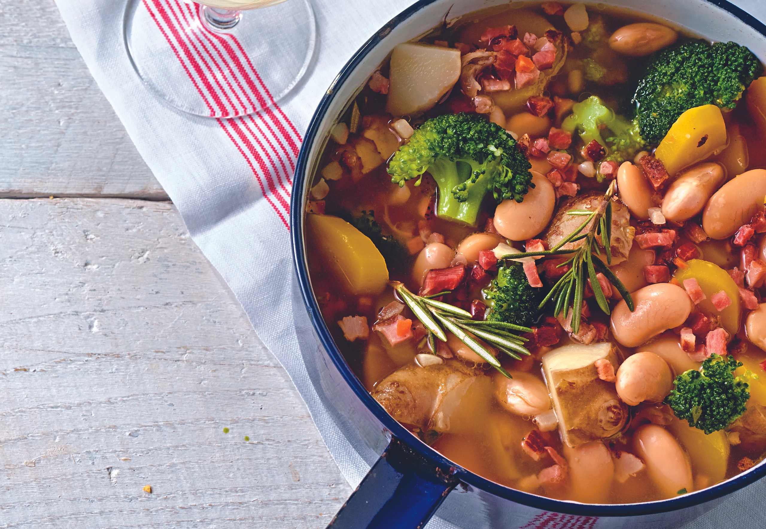 Öl erhitzen. Speck, Knoblauch, Rüben und Topinambur darin anschwitzen und mit Suppe aufgießen. Rosmarin zugeben und den Eintopf ca. 20 Minuten köcheln. Nach halber Garzeit Brokkoli zugeben und mitgaren. Knapp vor Ende der Garzeit Bohnen behutsam unterrühren und erwärmen. Eintopf mit Salz und Pfeffer würzen.