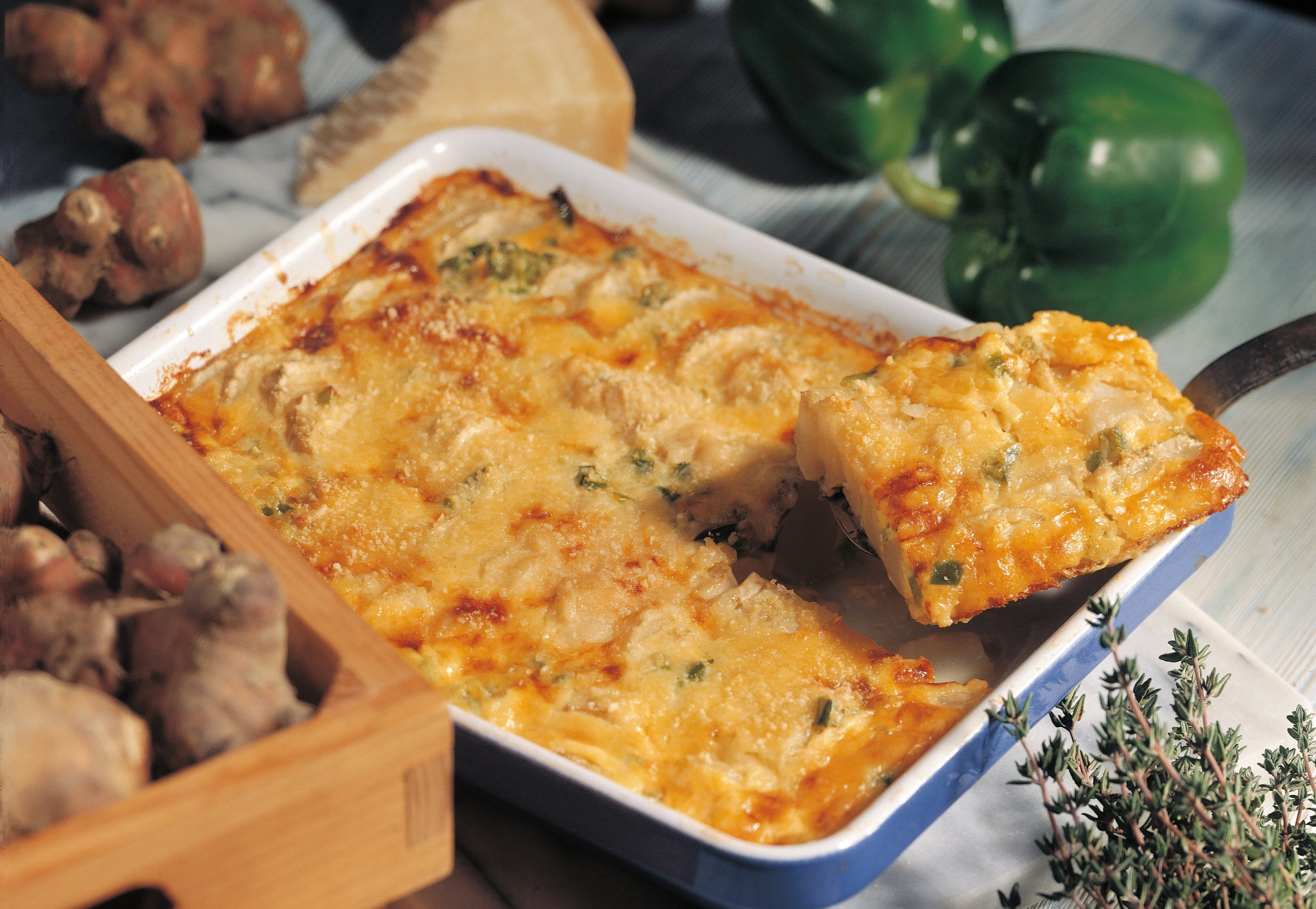 Paprika halbieren, Strunk und Kerne entfernen und das Fruchtfleisch kleinwürfelig schneiden. Topinambur schälen, in ca. 1/2 cm dicke Scheiben schneiden und mit Zitronensaft beträufeln. Topinambur in die Auflaufform schichten, mit den Paprikastücken bestreuen.