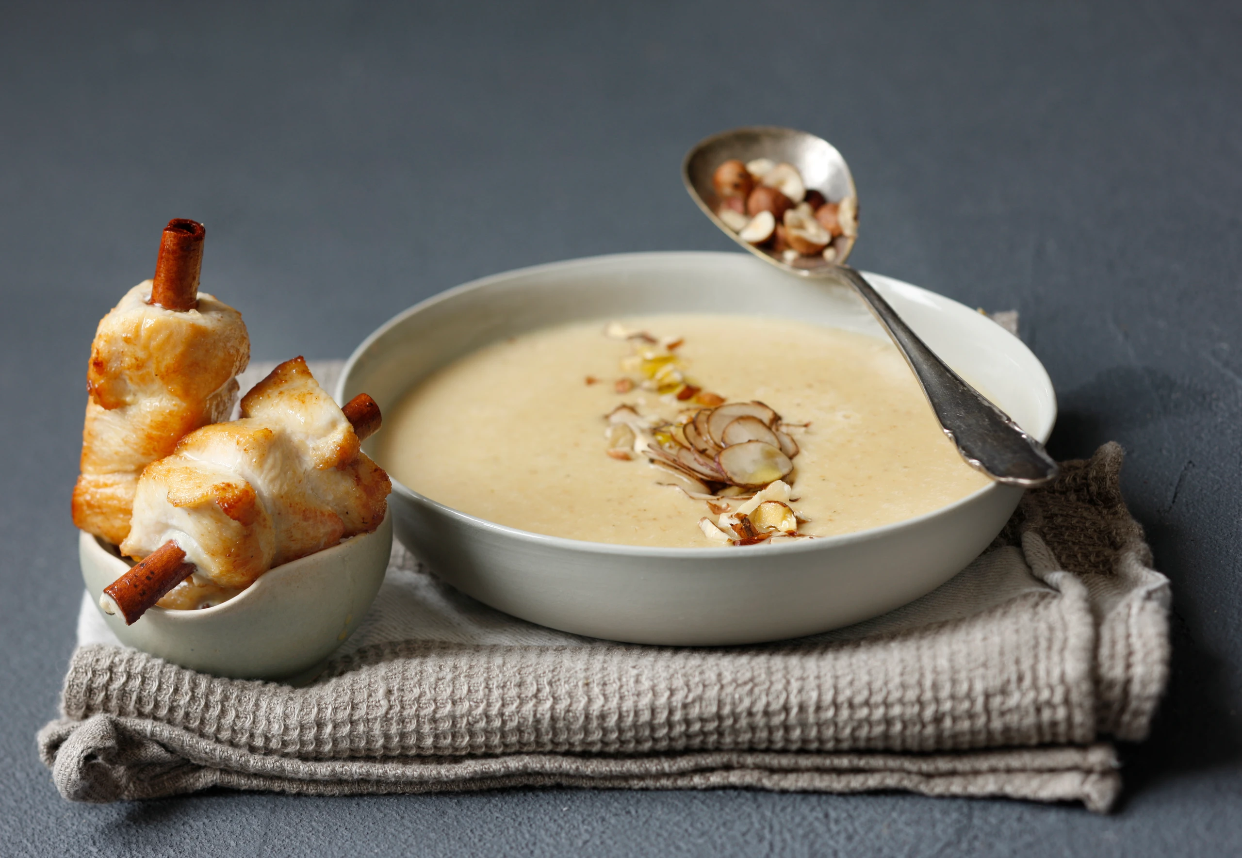 Topinambursuppe mit Hühner-Zimt-Spieß