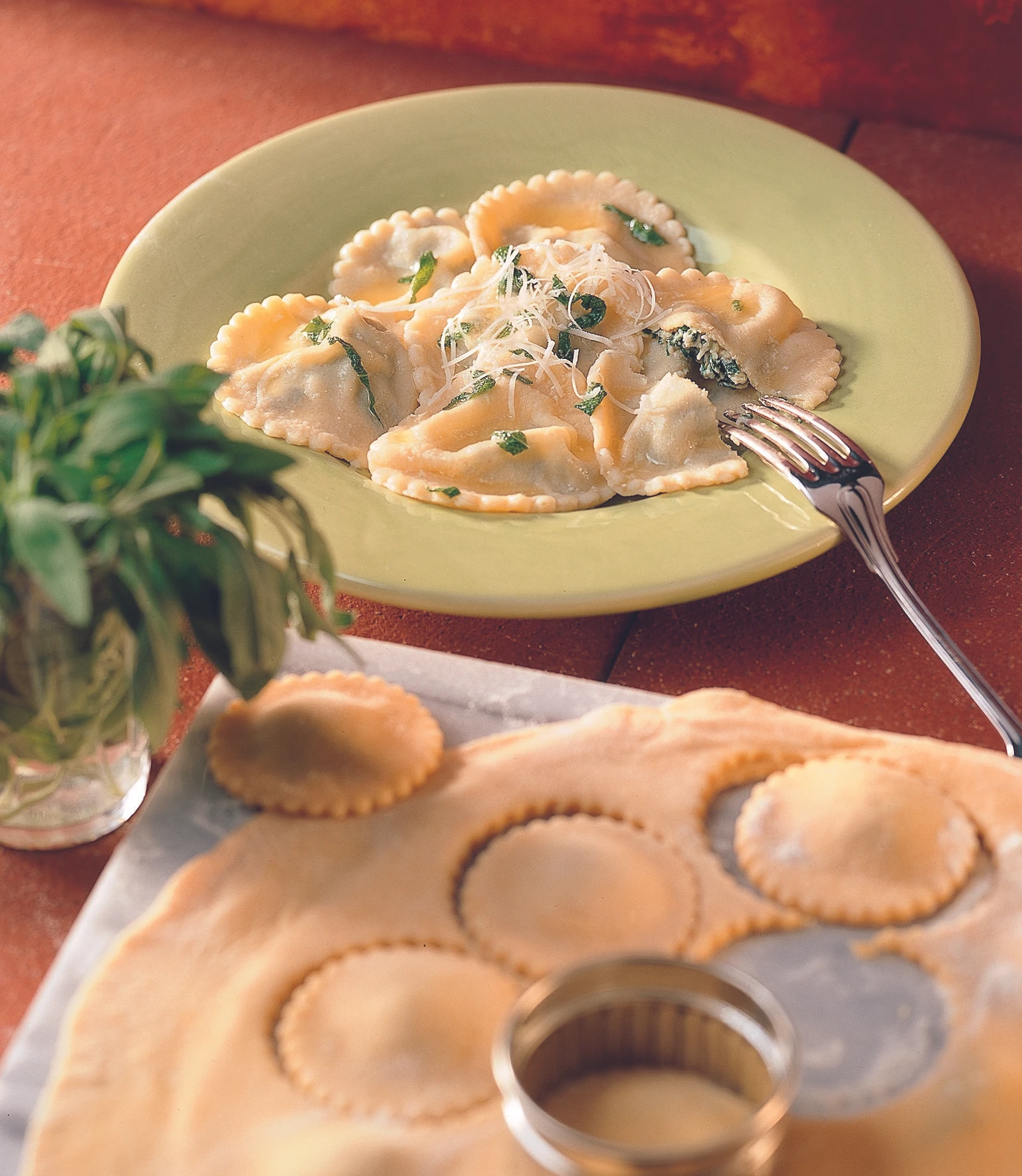 Zweites Teigblatt locker darüber legen. Teig rund um die Fülle mit den Fingern leicht andrücken, mit einem gezackten Ausstecher (Ø 6 cm) Scheiben ausstechen. Tortelli auf ein bemehltes Küchentuch legen und ca.15 Minuten antrocknen lassen.