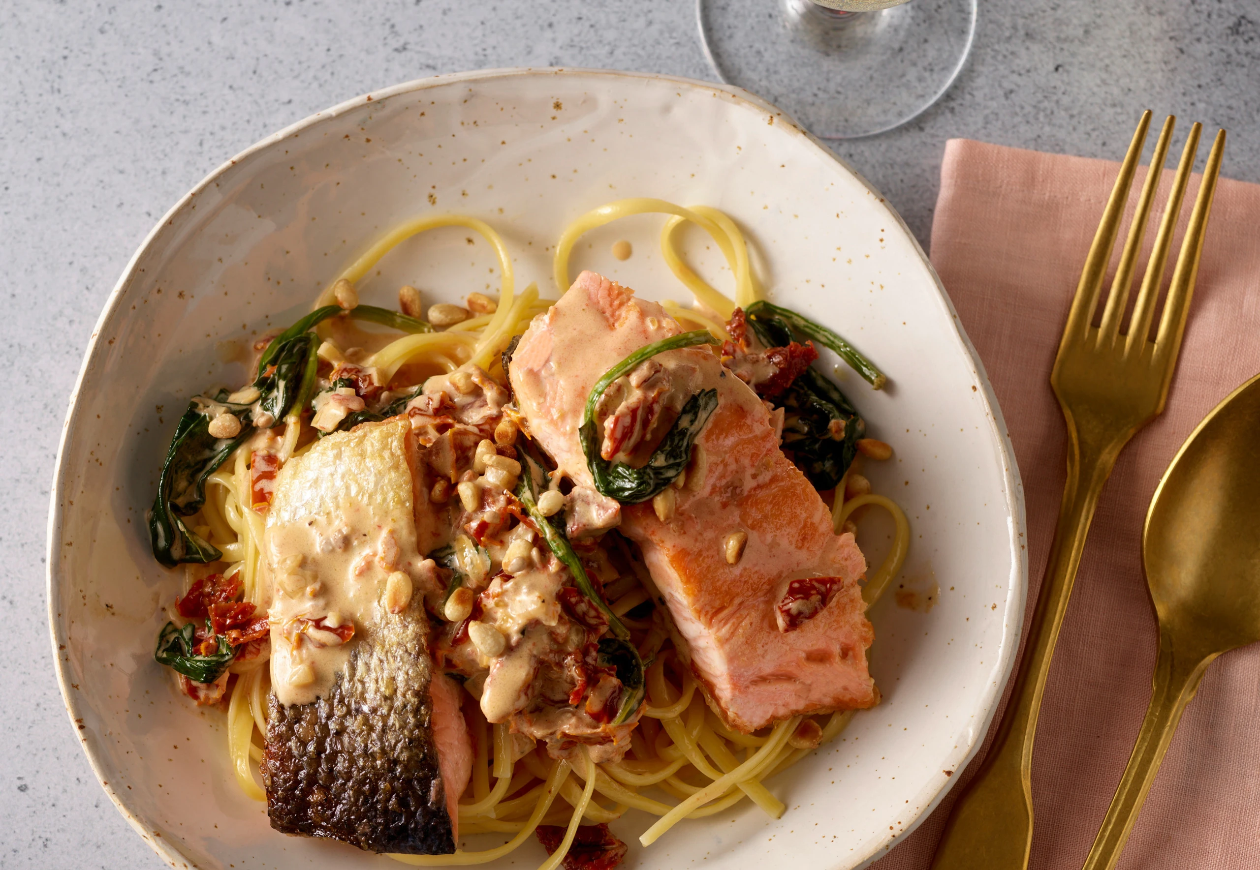 Paradeiser aus dem Öl nehmen, hacken und zugeben. Mit Obers aufgießen und aufkochen. Spinat, Zitronensaft und -schale zugeben, mit Salz und Pfeffer würzen. Lachs mit der Fleischseite nach unten in die Sauce legen und 5 Minuten köcheln. Mit der Pasta anrichten und mit Pinienkernen bestreuen.