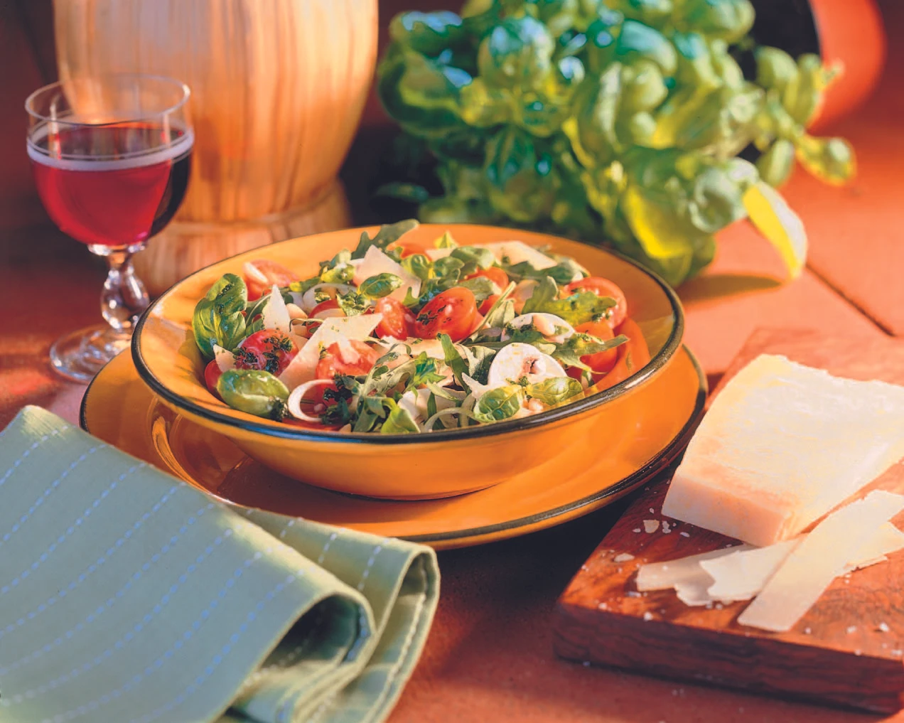 - Pilze, Paradeiser, Jungzwiebel und Rucola mit dem Dressing vermischen. Salat mit Basilikumblättchen, Parmesan und Pinienkernen bestreuen.