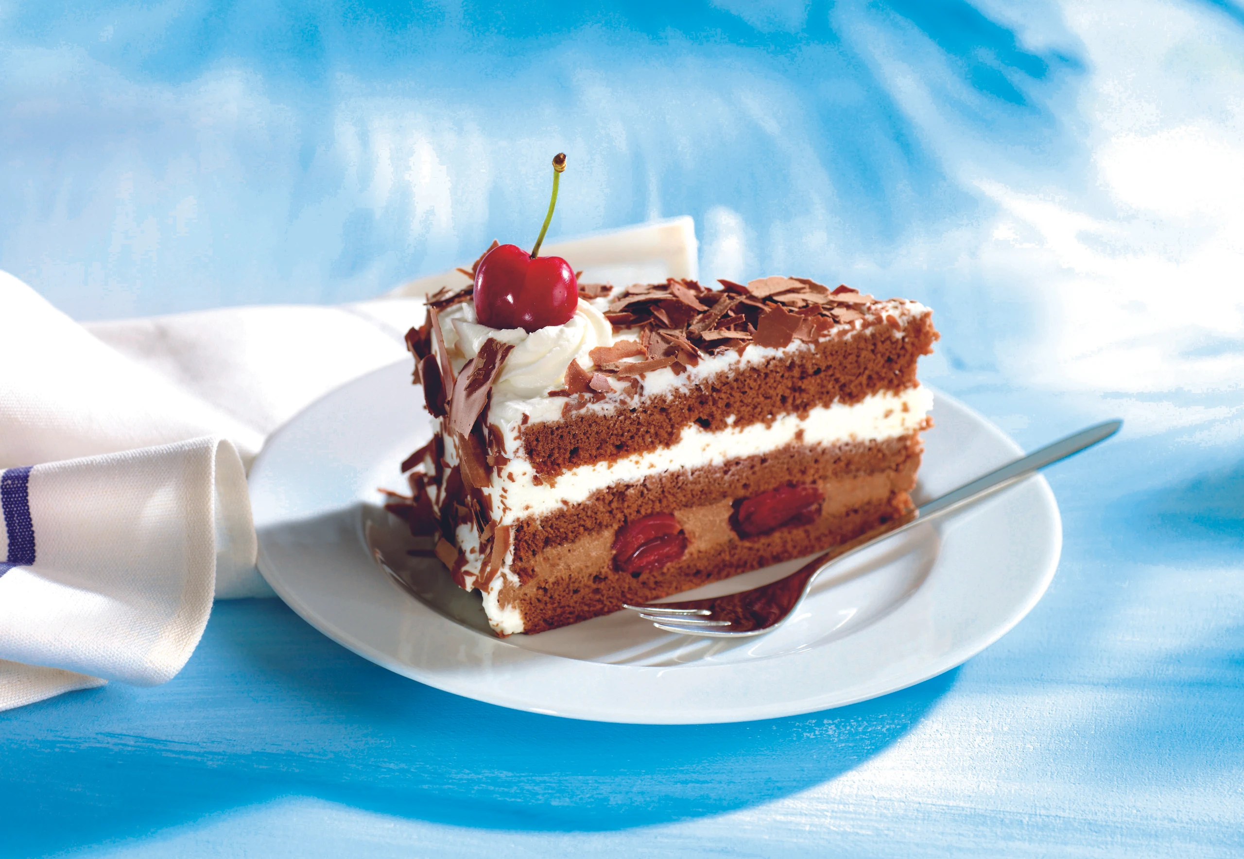 Für die Garnitur Obers schlagen. Torte damit einstreichen, mit Kirschen und Schokospänen garnieren.