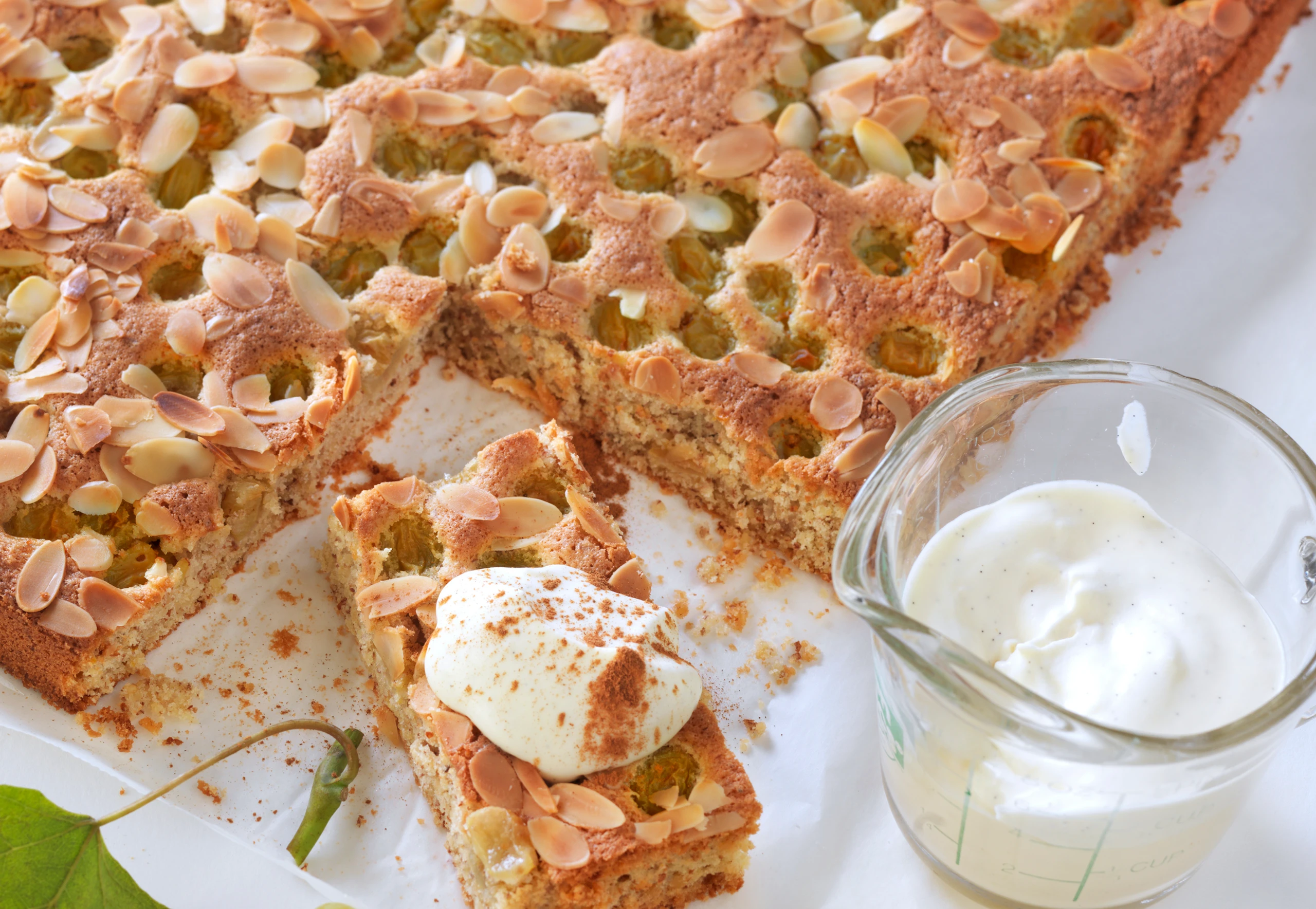 Masse gleichmäßig in der Form verstreichen, mit Trauben und Mandelblättchen bestreuen. Kuchen im Rohr (mittlere Schiene) ca. 45 Minuten backen.