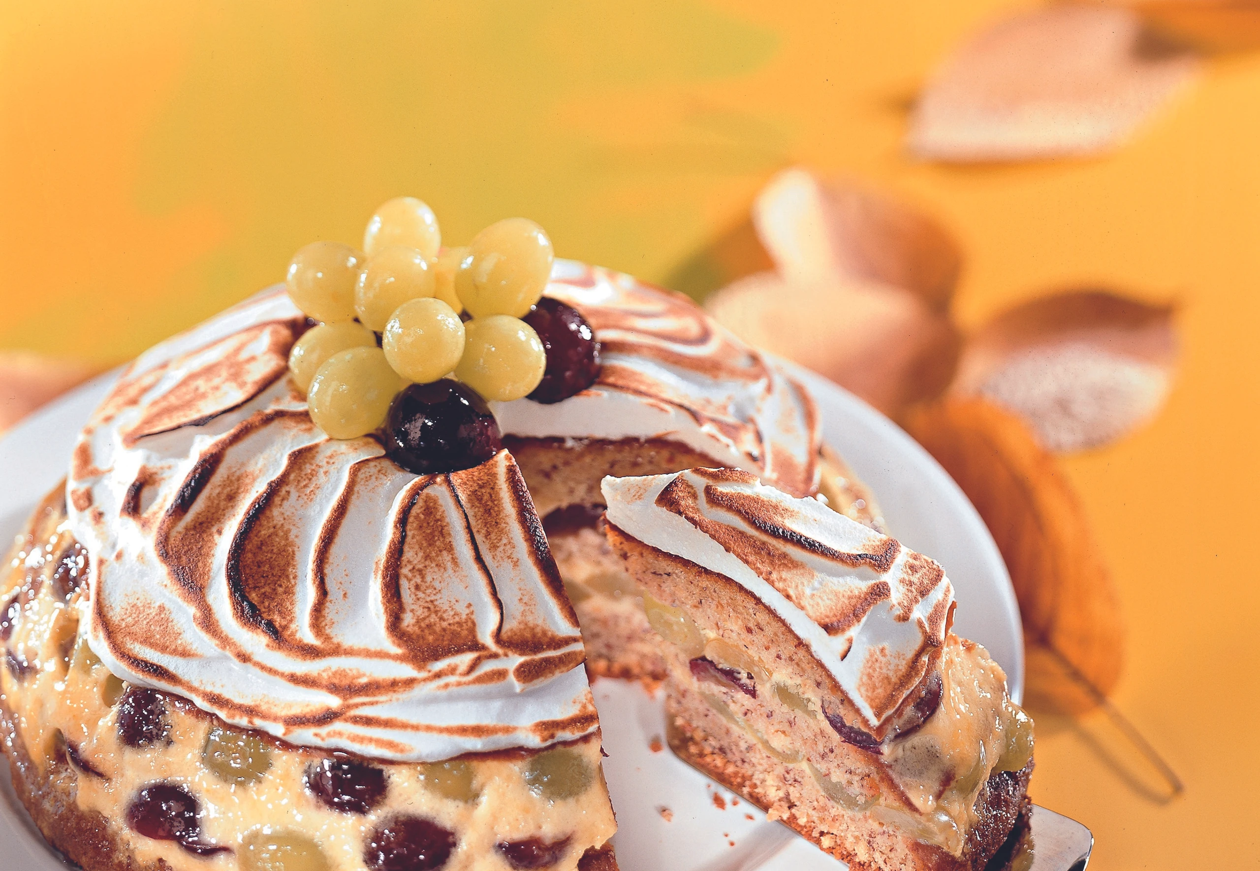Kuppel aus der Form stürzen und mit Marmelade einstreichen. Eiklar mit Staubzucker cremig schlagen. Kuppel mit der Masse rundum einstreichen und mit einer Lötlampe flämmen. Mit Weintrauben dekorieren.