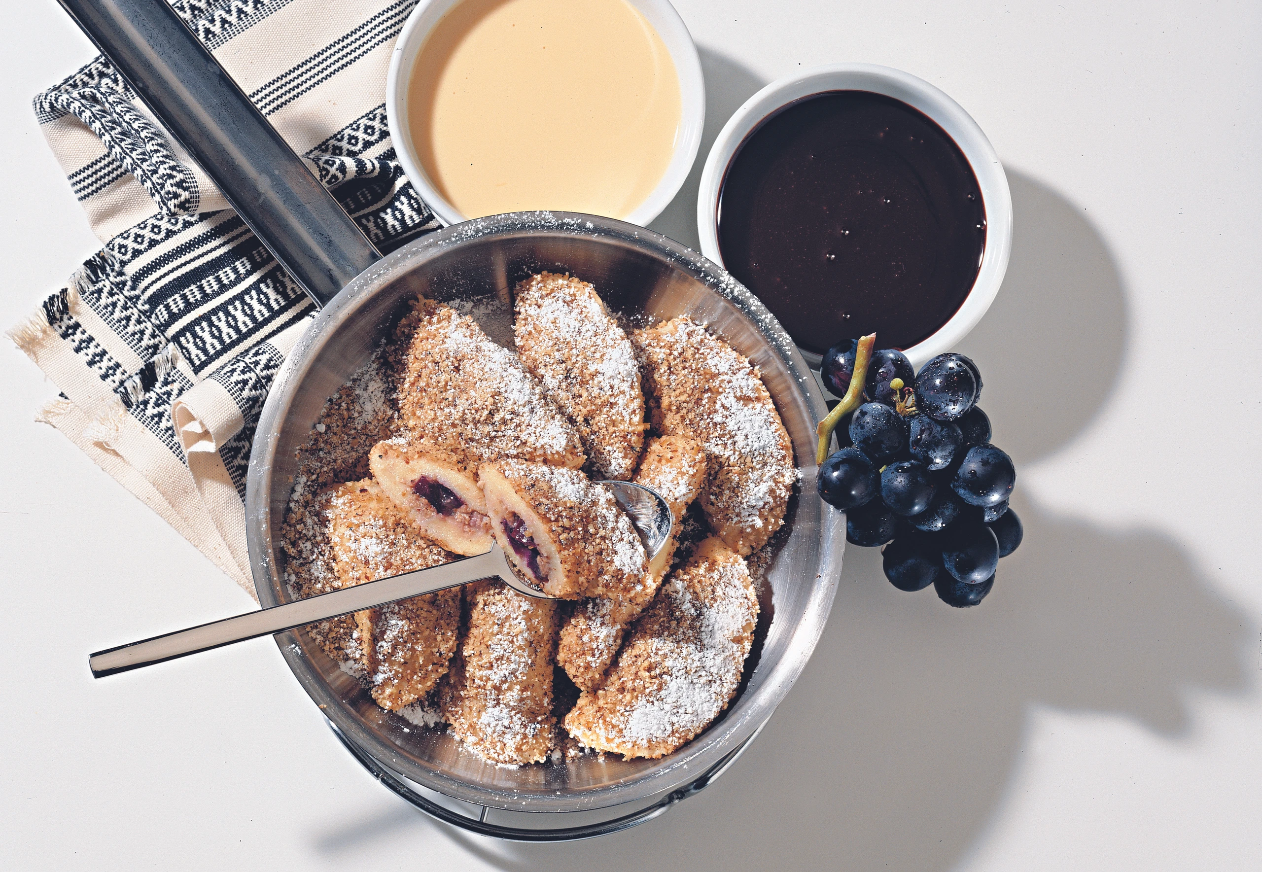 Trauben-Nuss-Tascherl mit Vanillesauce und Schokoladesauce