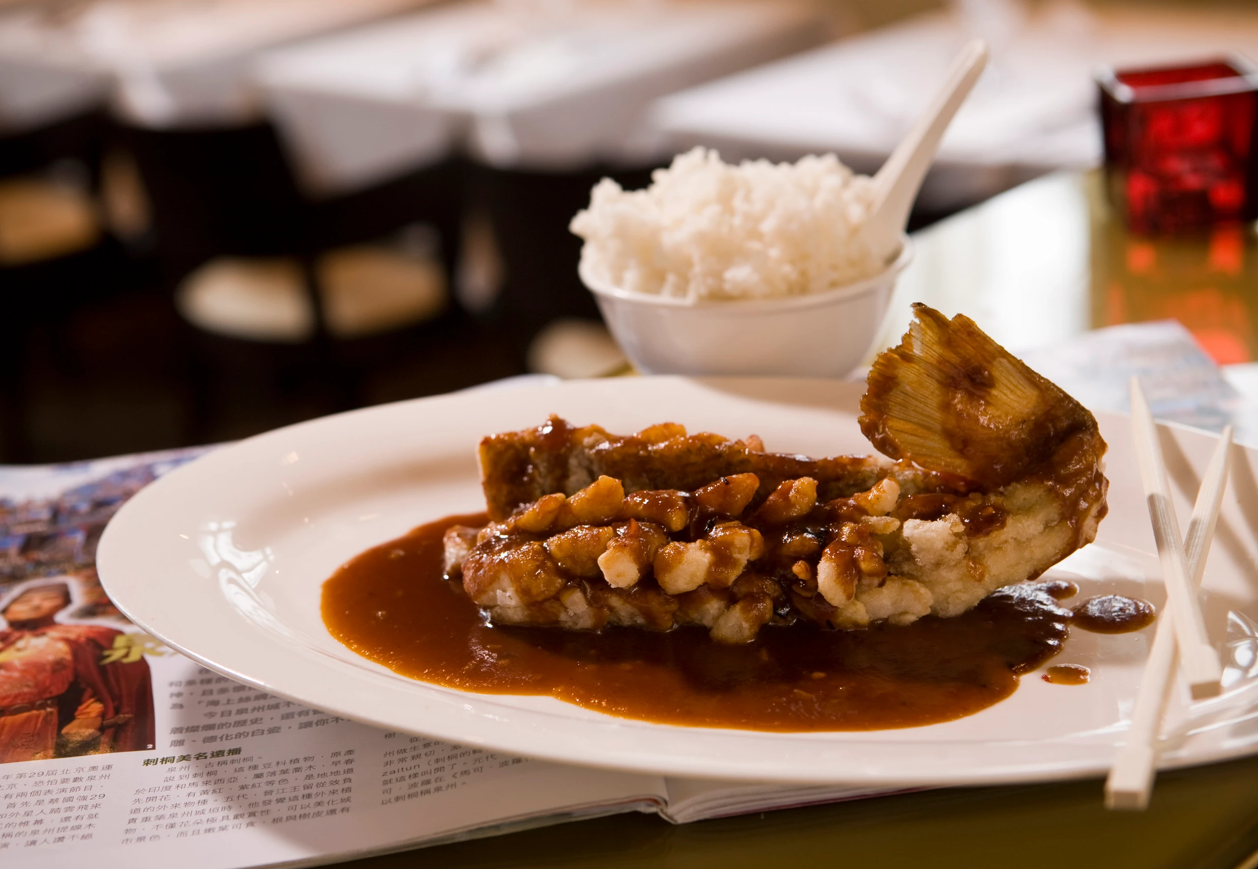 Im Wok ca. 3 Finger hoch Öl erhitzen. Fischfilets in Stärkemehl tauchen, übriges Mehl abklopfen. Filets im Öl goldbraun backen (ca. 5 Minuten). Herausheben und abtropfen lassen. Auf einer Platte anrichten, mit der Sauce übergießen und mit gedünstetem Reis servieren.