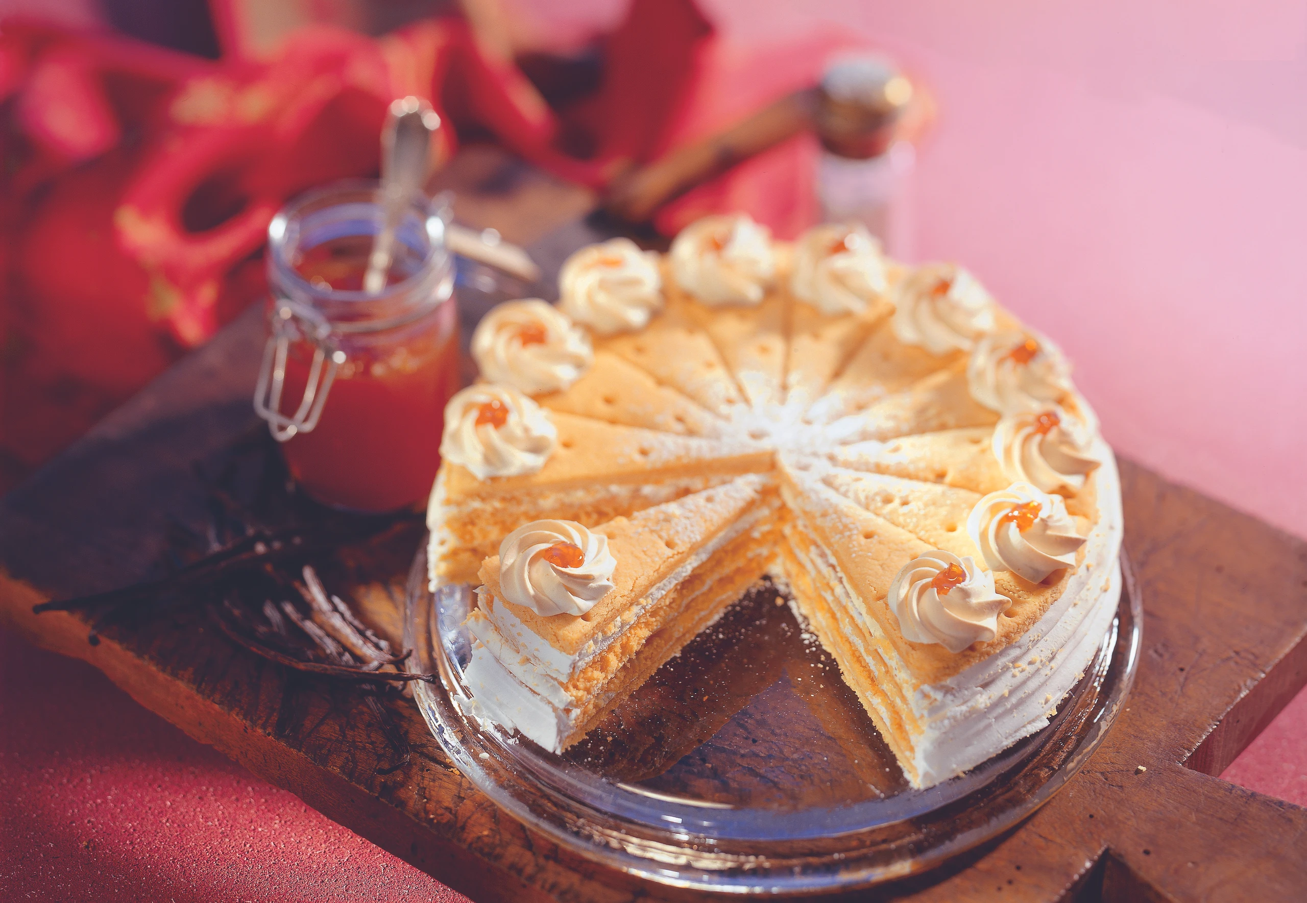 - Marmelade glatt rühren. 3 Teigscheiben (die Scheibe mit Segmentmuster beiseite legen) zuerst mit Marmelade, dann mit zwei Dritteln der Creme bestreichen. Teigscheiben übereinander setzen. Torte rundum mit übriger Creme einstreichen, mit einer Kamm-Teigkarte Rillen in die Schneemasse ziehen. Segment-Teigscheibe auf die Torte legen und behutsam andrücken. Mit der restlichen Schneemasse Rosetten auf die Torte spritzen, mit einem Tupfer Marillenmarmelade garnieren. Torte 1 Tag kühl rasten lassen, mit Staubzucker bestreut servieren.