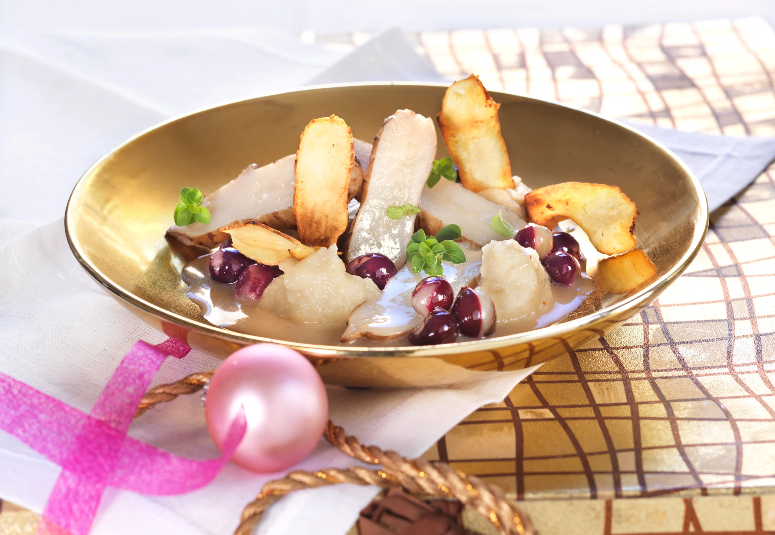 - Übrige Butter in einer Pfanne erhitzen, Trauben darin schwenken, bis die Haut platzt. Kochfond mit dem Stabmixer aufschäumen. Gedämpfte Topinambur mit Püree, Chips, Fond und den Weintrauben anrichten.