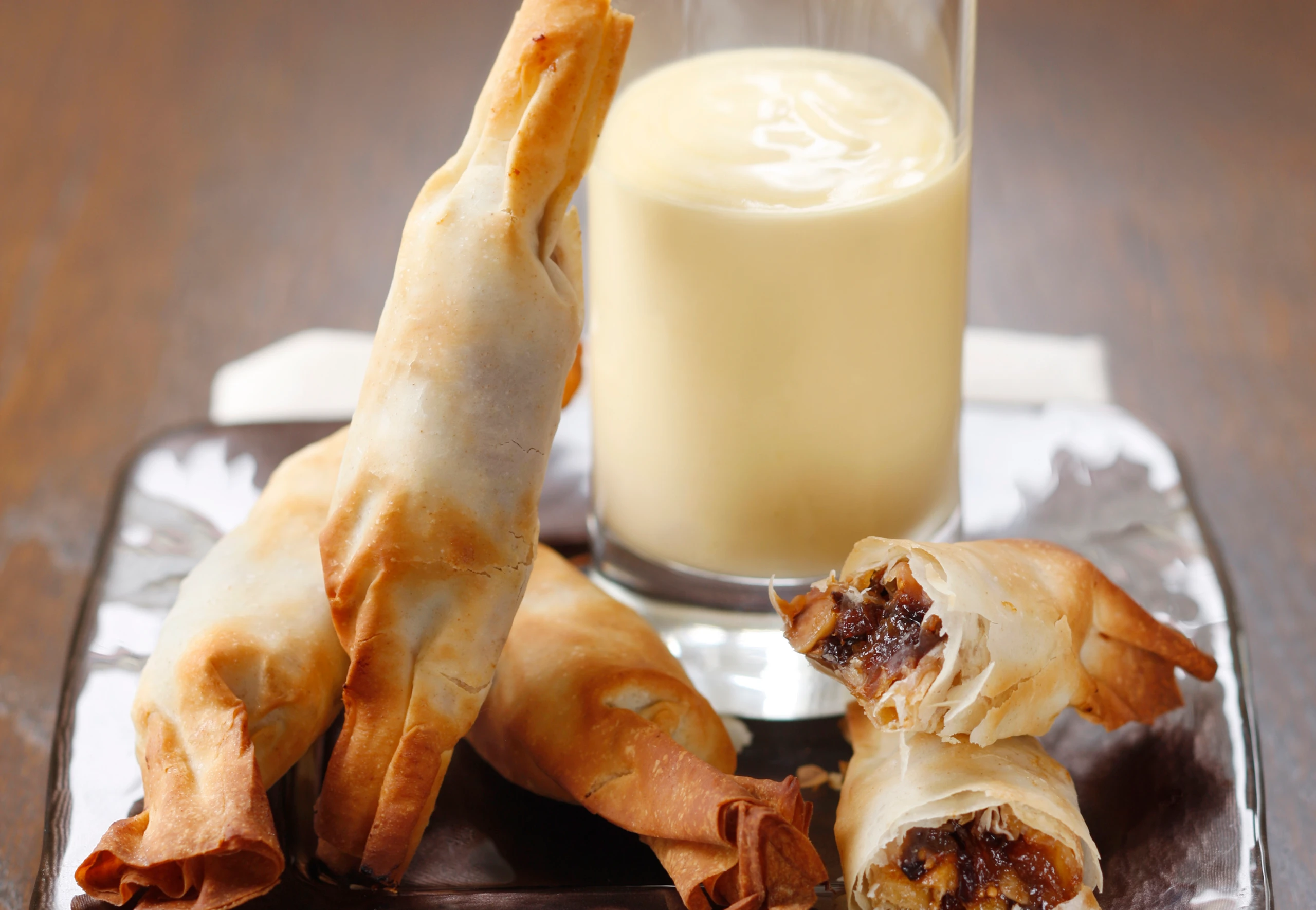 Rohr auf 200°C vorheizen. Backblech mit Backpapier belegen. Ein Strudelblatt auf ein befeuchtetes Geschirrtuch legen und dünn mit Butter bestreichen. Zweites Blatt darauflegen und ebenfalls dünn mit Butter bestreichen. Teig in 6 Rechtecke (ca. 15 x 12 cm) schneiden.