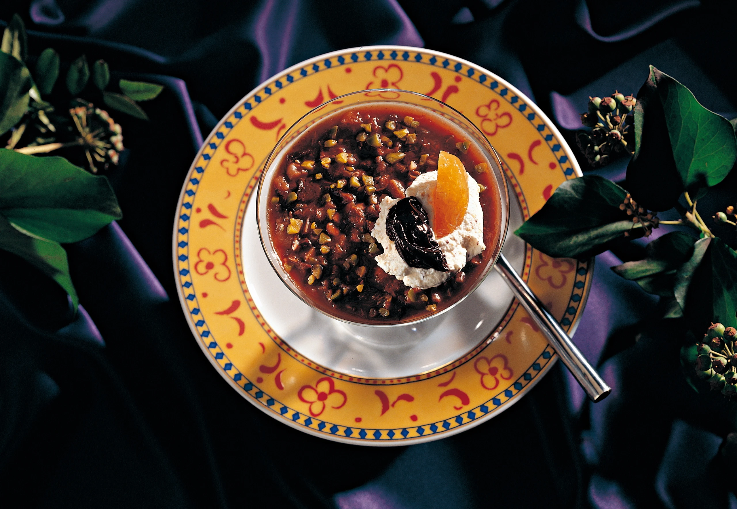 Früchtemischung in Gläser oder Schüsseln füllen und zum Festwerden in den Kühlschrank stellen (dauert mindestens 4 Stunden). Trockenfrüchte-Gelee mit Nuss-Obers servieren