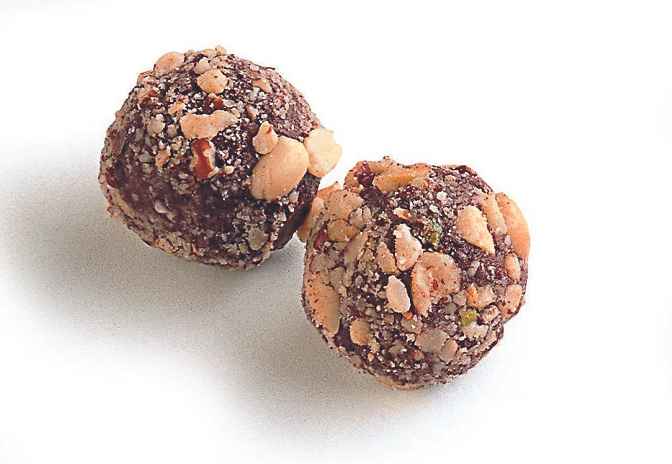 Aus der Masse 50 Kugeln formen, in gehackten Mandeln wälzen und in kleine Papiermanschetten setzen.