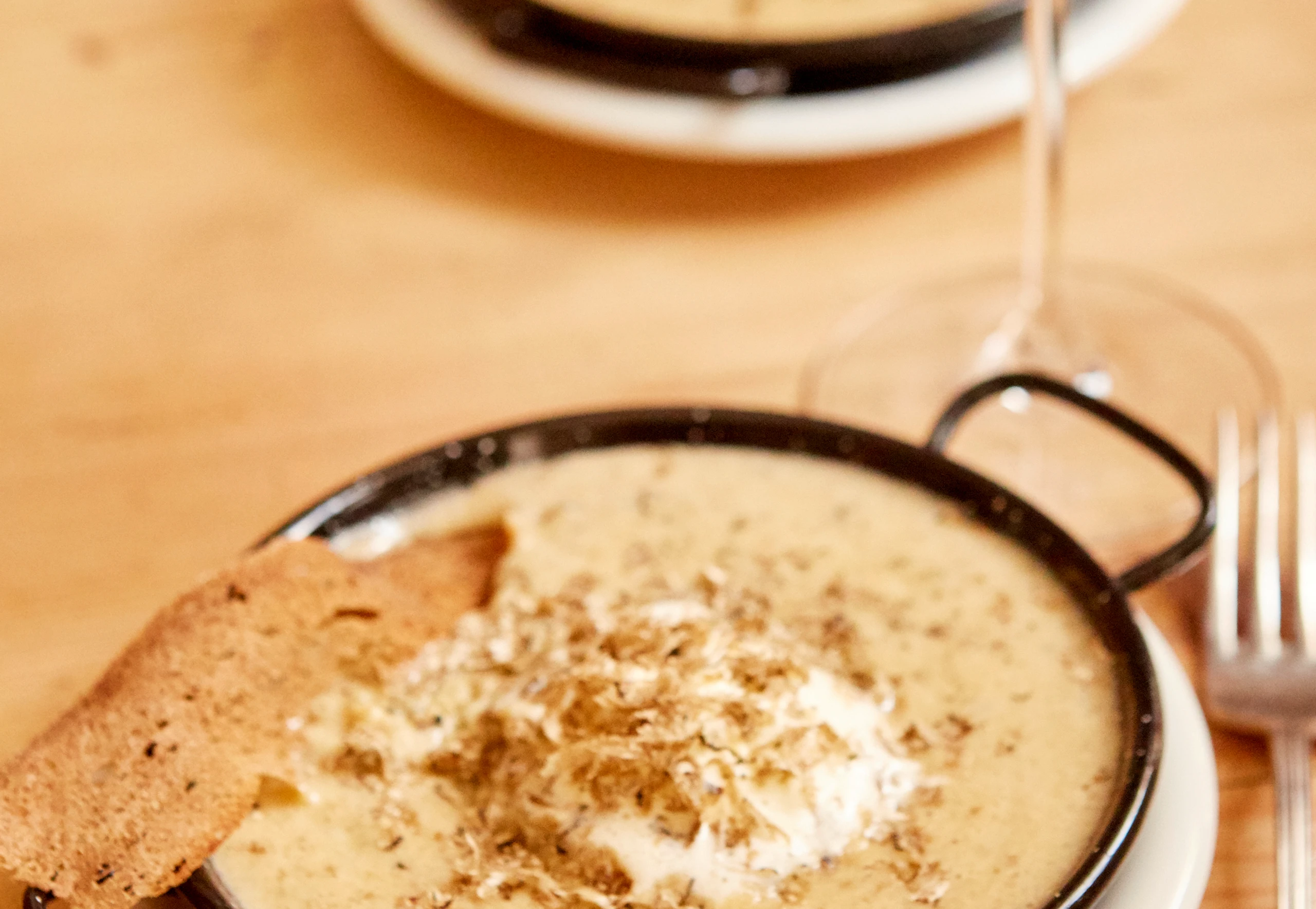 Butter in einem Schneekessel über Dampf zerlassen. Eimischung zugießen und die Masse mit einem Schneebesen dickcremig warm (ca. 74°C) aufschlagen. Rührei anrichten, mit Obers garnieren, mit Trüffelraspel bestreuen und mit den Brotchips servieren.