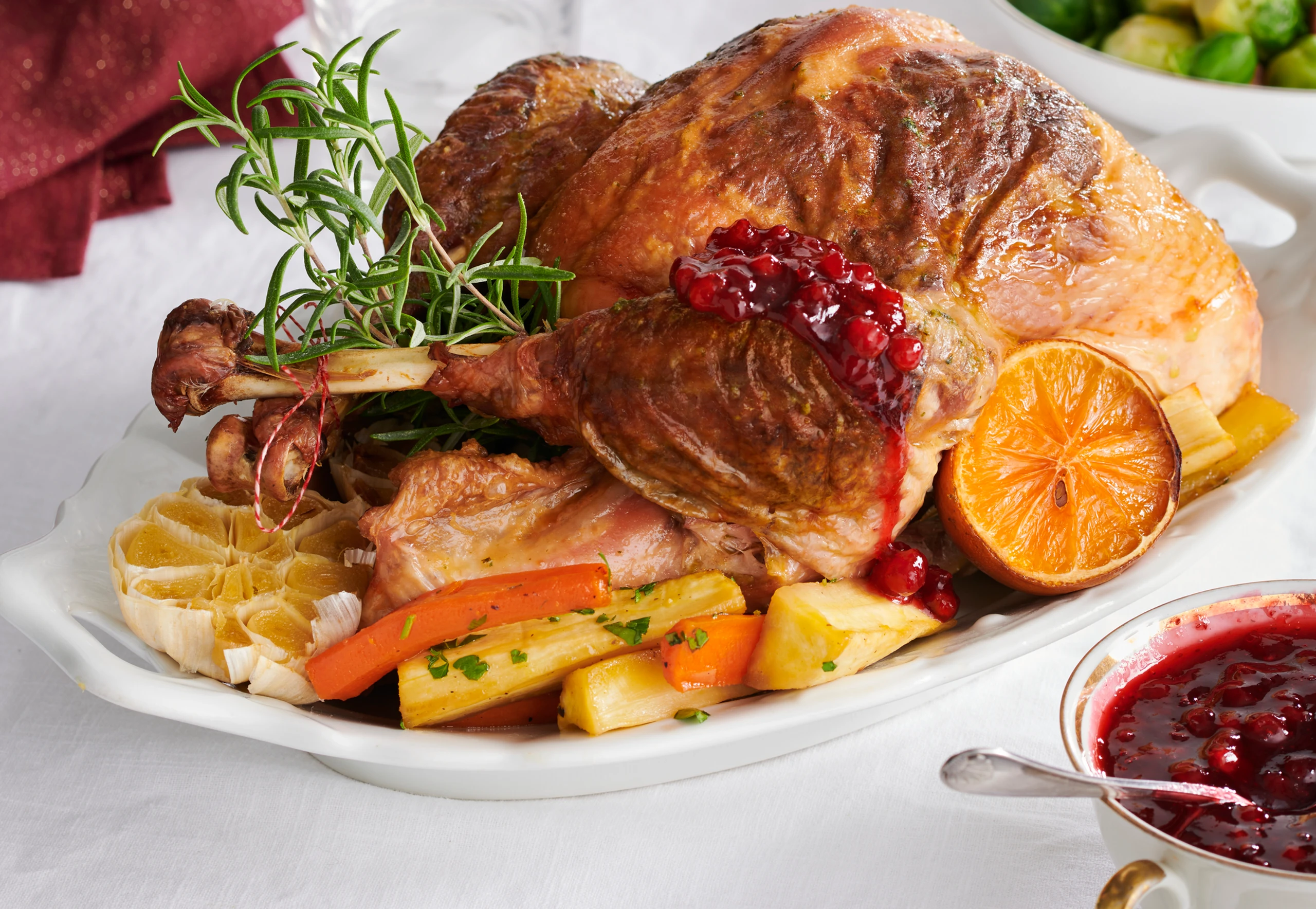 Butter in einen Dressiersack füllen und die Spitze abschneiden. Kräuterbutter unter die Haut spritzen. Haut straff darüber spannen und durch Drücken die Butter gleichmäßig verteilen. Truthahn auf ein Blech legen, mit Alufolie abdecken und im Rohr (unterste Schiene) ca. 2 ½ Stunden garen. Folie entfernen, Truthahn weitere 30 Minuten braten. Truthahn herausnehmen und ca. 10 Minuten rasten lassen. Eventuell mit Preiselbeerkompott, geschmorter Knoblauchknolle und Orangenscheiben servieren. Dazu passen glasiertes Gemüse (Rezept S. 92), Herzogin-Erdäpfel und Pancetta-Kohlsprossen (Rezepte S. 96).