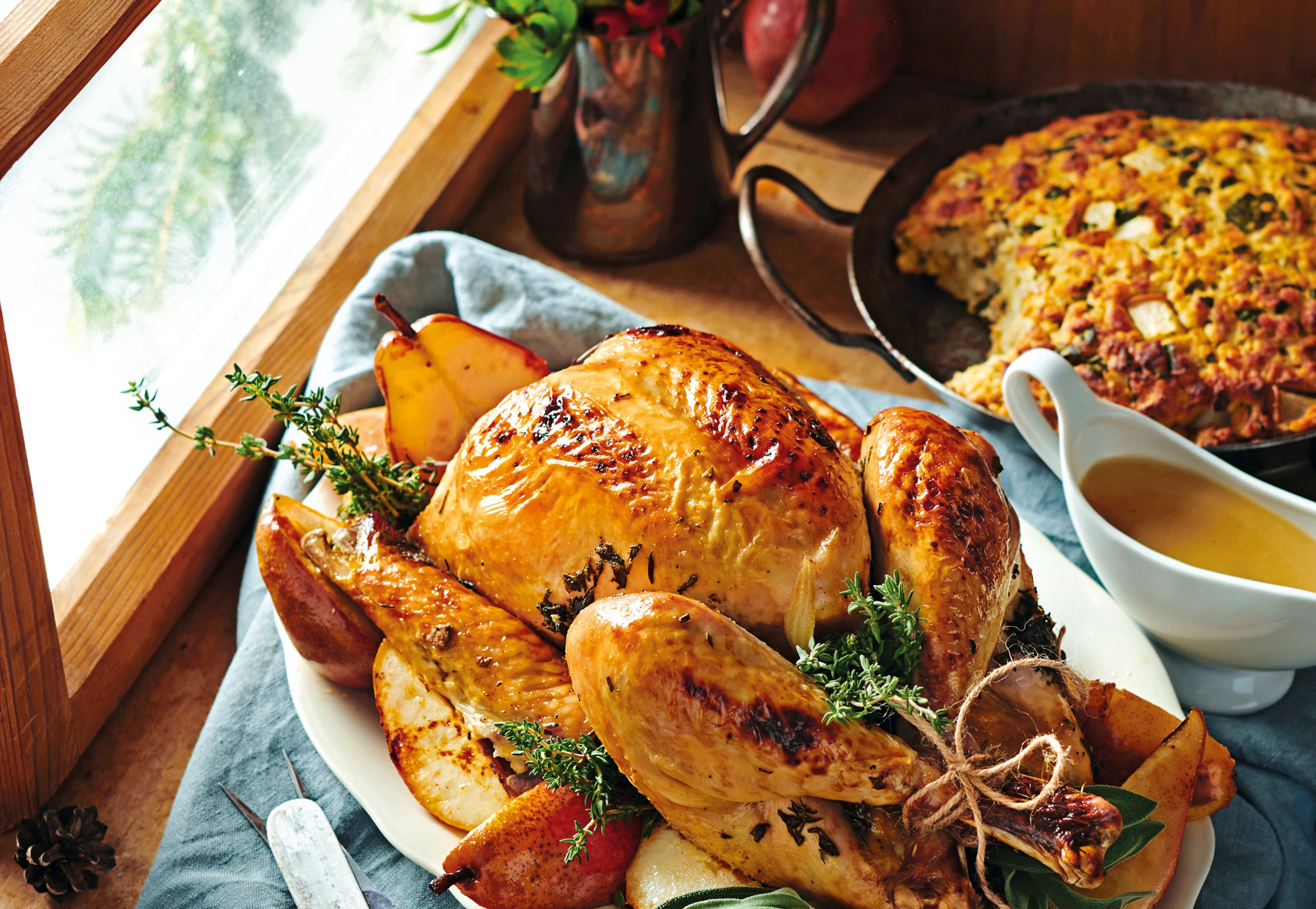 Truthahn mit Semmelauflauf und Birnen