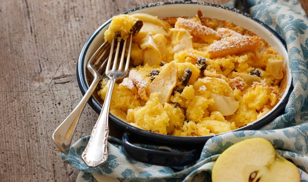 - Tommerl mit zwei Gabeln in Stücke zerreißen, im Rohr weitere 10 Minuten backen. Tommerl mit Staubzucker und Zimt bestreuen und warm servieren.