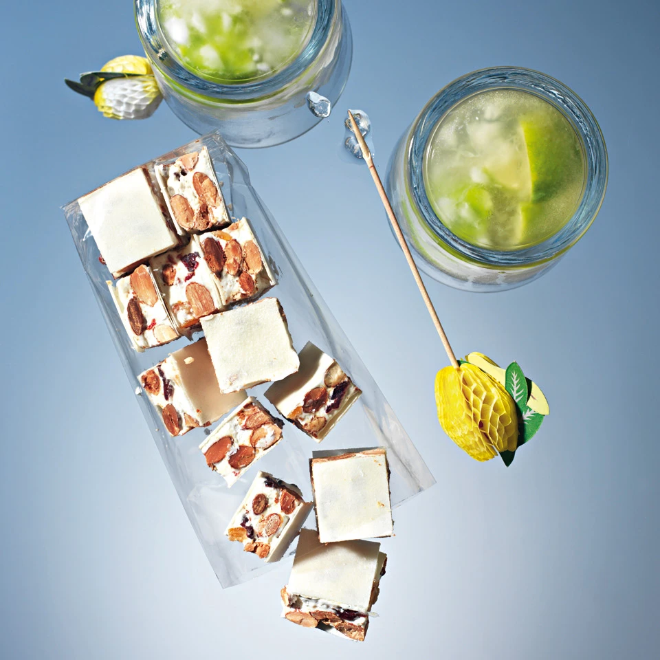 - Wasser, Zucker und Honig verrühren und ca. 10 Minuten köcheln. Eiklar zu steifem Schnee schlagen, Zuckermischung unterrühren. Masse weiterschlagen, bis sie weiß und lauwarm ist. (Nicht zu lange schlagen: Wenn die Masse abkühlt, wird sie fest.) Mandeln und Cranberries unterrühren.
