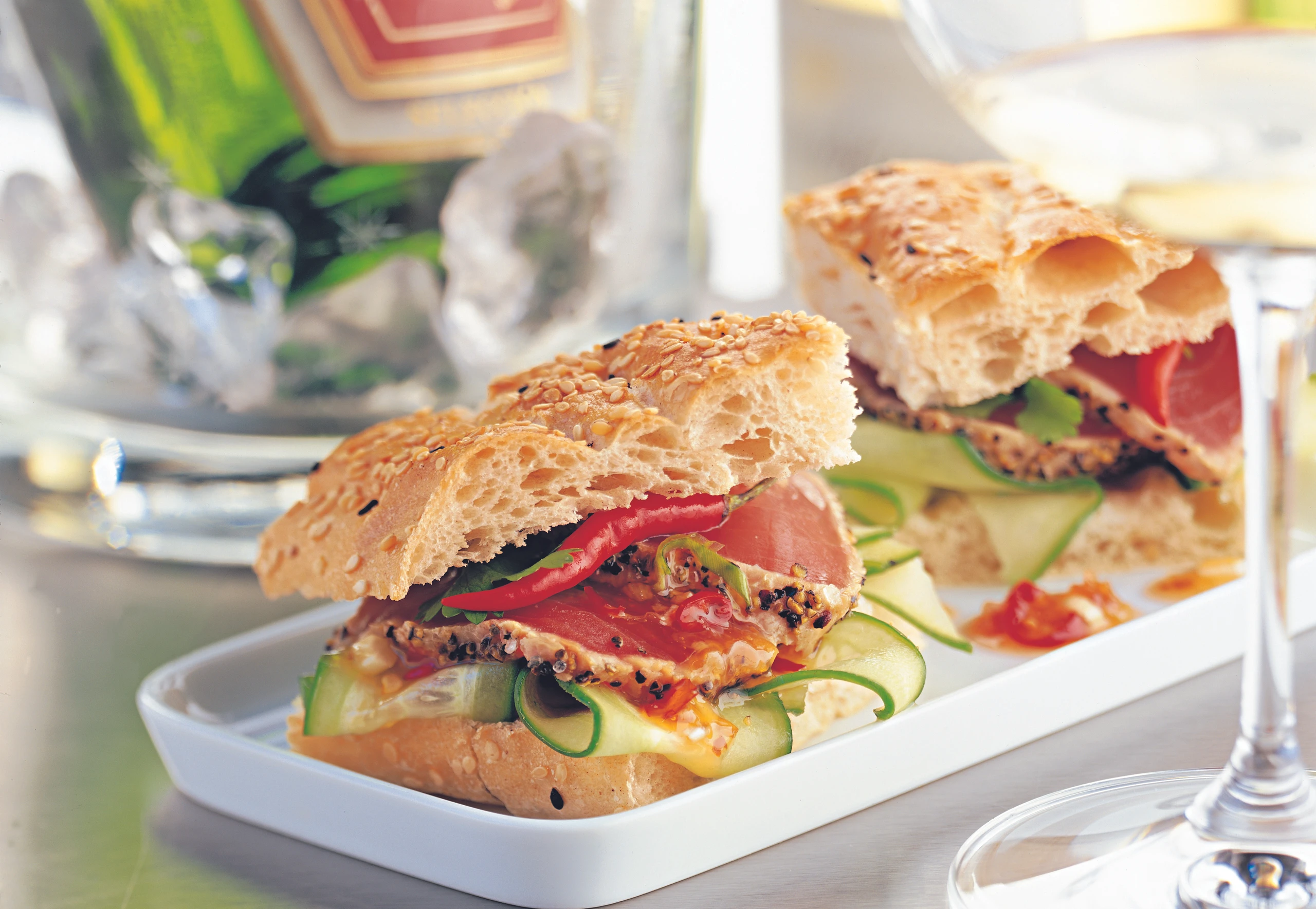 Brote vierteln, mit Korianderblättchen, Gurken und Thunfisch belegen, mit der Salsa beträufeln.