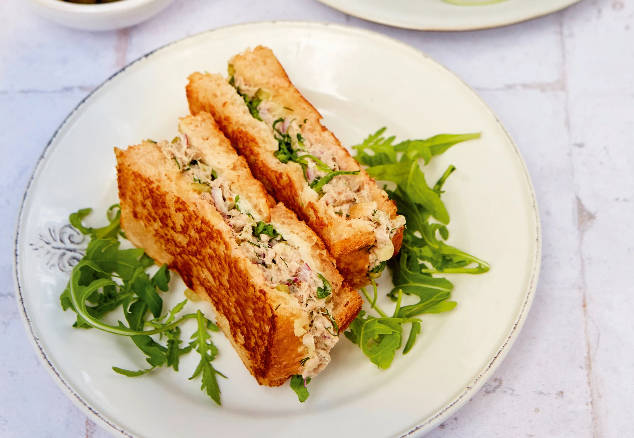 - Eine Scheibe Toastbrot mit je einem Viertel von Rucola, Thunfischfülle und Bergkäse belegen, zweite Scheibe auflegen. Restliche Brote ebenfalls belegen.