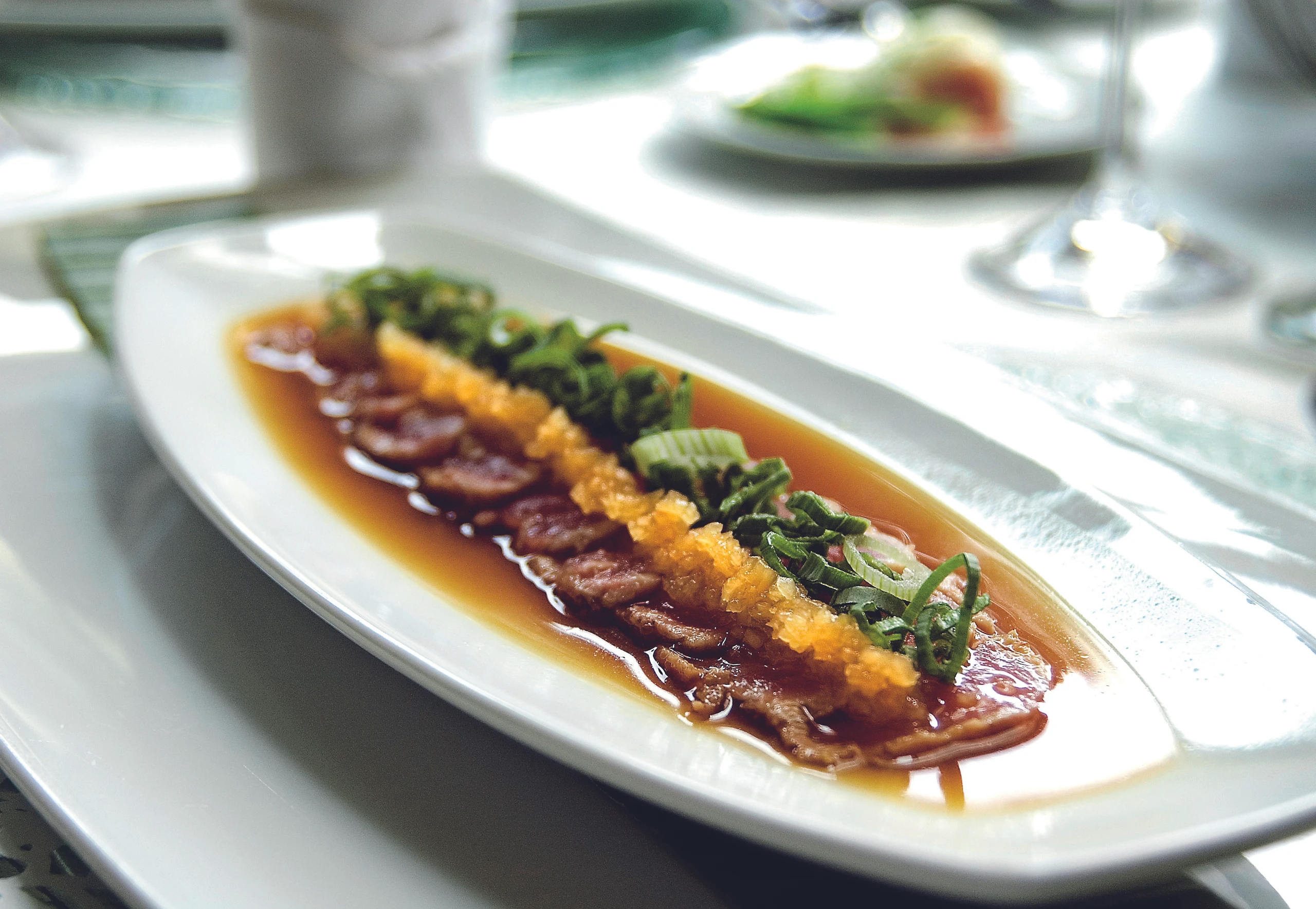 Ponzu-Zutaten vermengen. Für das Zwiebelponzu Zwiebel schälen, sehr fein schneiden, in einem Sieb abspülen, abtropfen lassen. Mit Öl, 50 ml vom Ponzu und Knoblauchpüree vermengen. Jungzwiebel in feine Streifen schneiden.