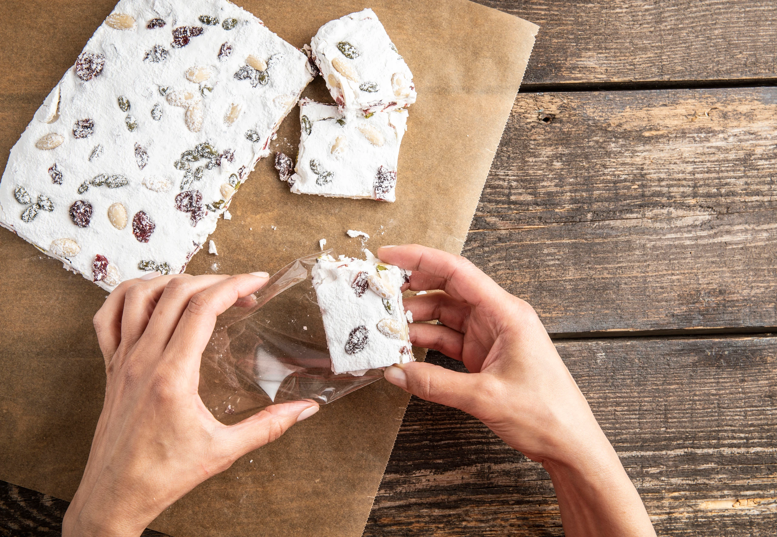 Mandeln, Pistazien und Cranberrys untermischen. Arbeitsplatte und Hände mit Staubzucker stauben. Masse mit einer Teigkarte bearbeiten, bis sie etwas fester wird. Turrón formen, mit Staubzucker bestreuen und ca. 2 Stunden an einem kühlen Ort fest werden lassen.
